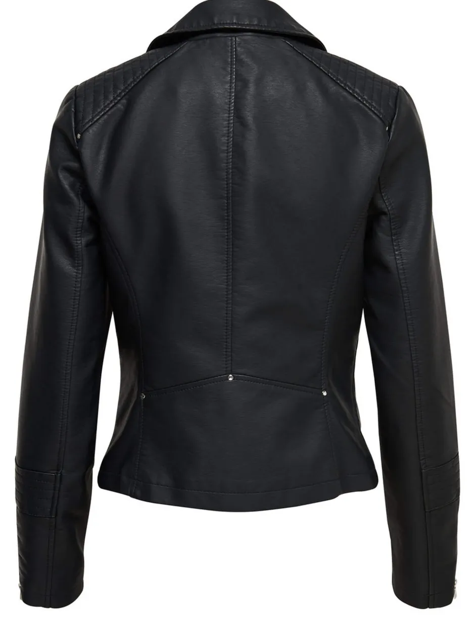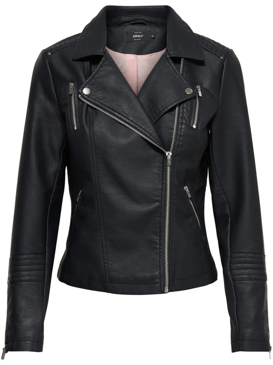 Onlyn lyhyt bikertakki synteettistä materiaalia. Vino vetoketjukiinnitys, vetoketjutaskut.