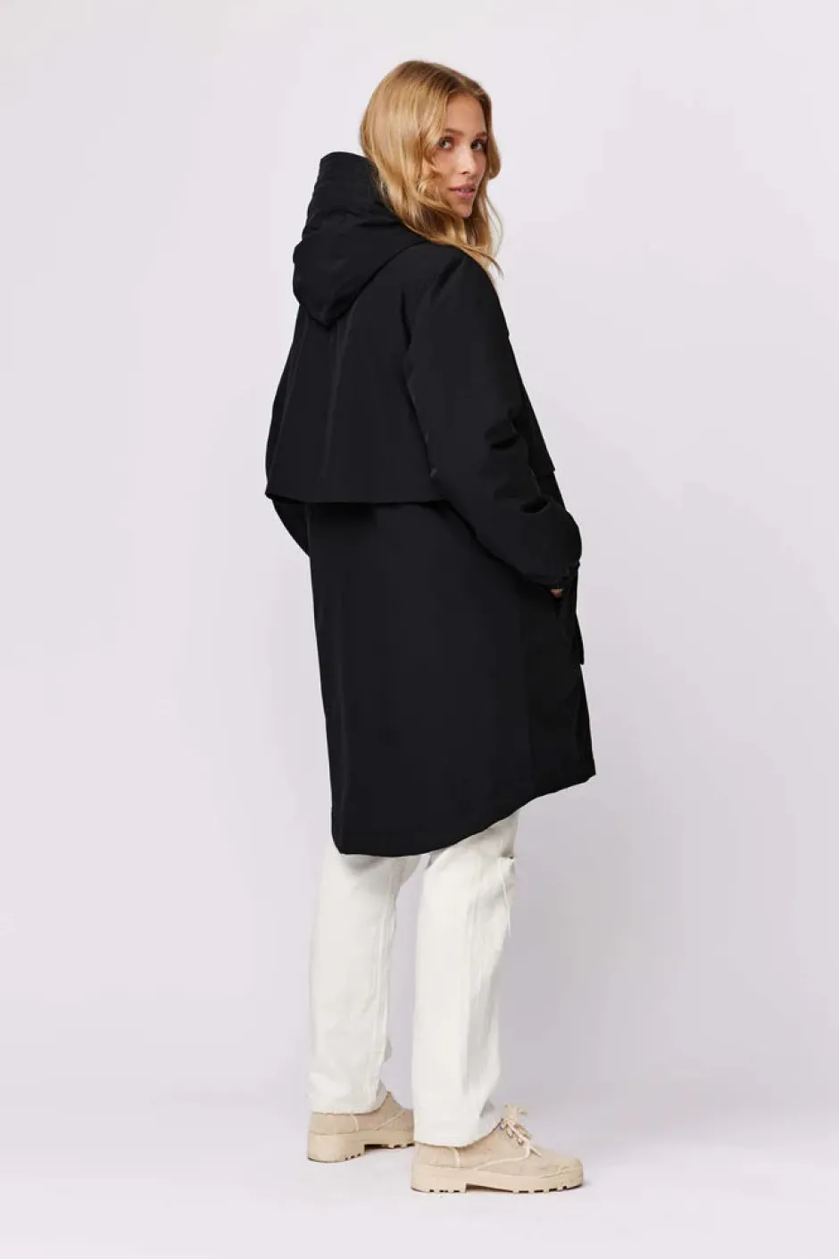 Pidempi ja rento takki talvikäyttöön. Kevyesti topatussa Laina-takissa on snorkkelihuppu, joka suojaa tuulelta. Takin helma on hieman pidempi takaa. Voit säätää istuvuutta vyötärön kiristysnyörillä tarvittaessa.