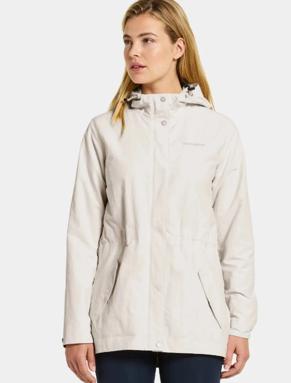 Maria on rento takapuolelta pidennetty parka, jossa on klassinen Didriksons-raitavuori, mikä tekee tästä parkasta loistavan valinnan jokapäiväiseen käyttöön. Takissa on kaksi taskua sekä säädettävä vyötärö ja huppu. Kangas on vettähylkivää ja valmistettu 100% kierrätetystä polyamidista, joka tuntuu pehmeältä.