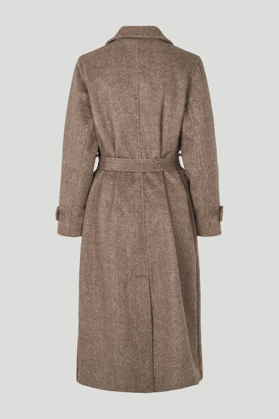 Sabotage on pitkä, kietaisuefektillä varustettu takki, jossa on selkeä vyötärö ja leveä kaulus. Vyökiinnitys ja yksi nappi antavat elegantin ilmeen.