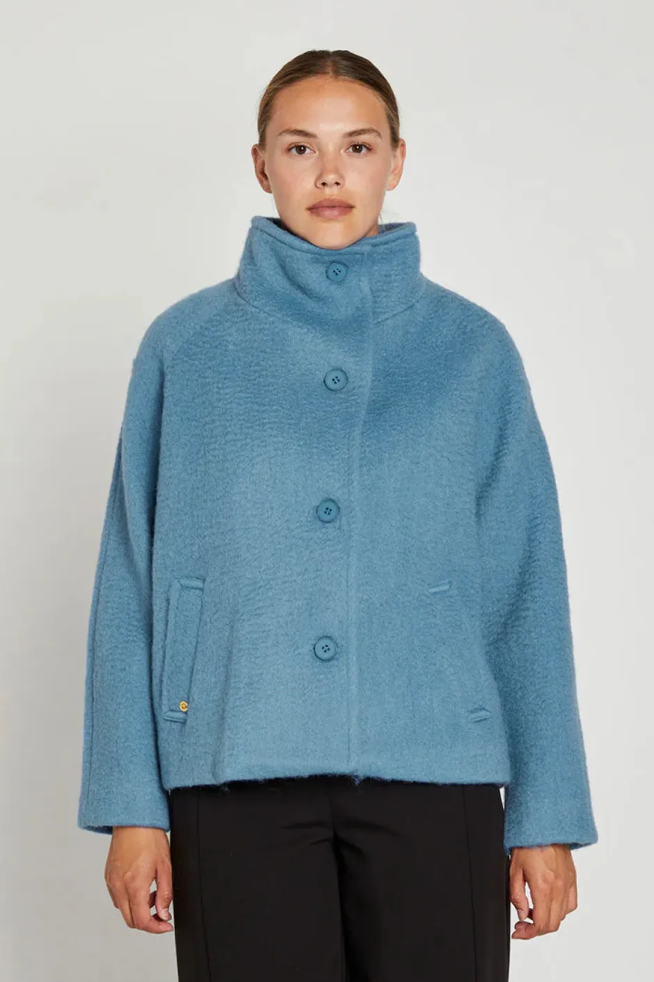 Moderni takki, jossa on raglan-hihat ja nappikiinnitys. Yksilöllinen twist-kaula-aukko ja epäsymmetrinen muotoilu tuovat hienostuneen ilmeen, joka erottuu syksyn vaatekaapissa.