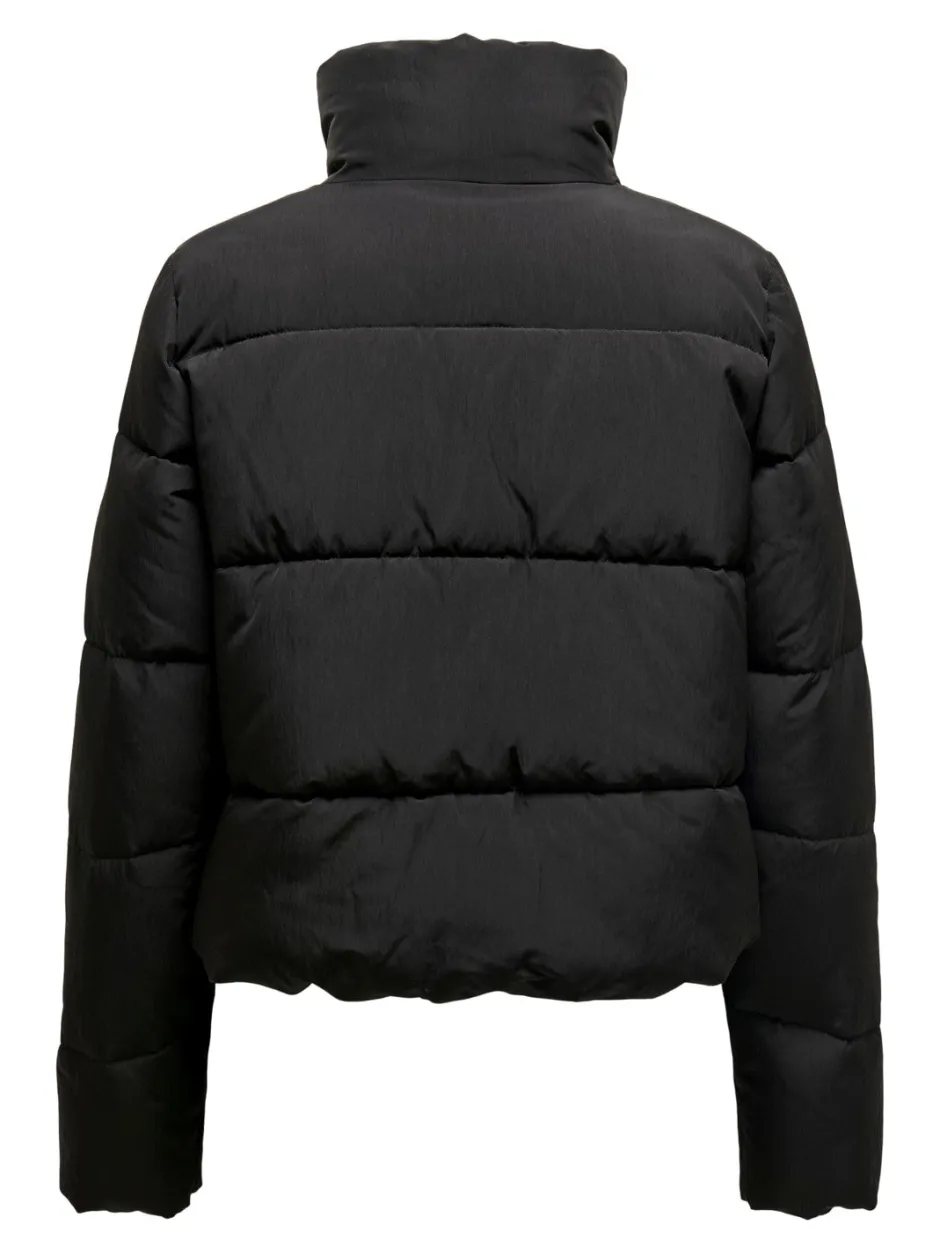 Onlyn lyhytmallinen puffer -toppatakki. Muhkea ja lämmin takki, jossa on korkea kaulus. Edessä vetoketjukiinnitys ja taskut.