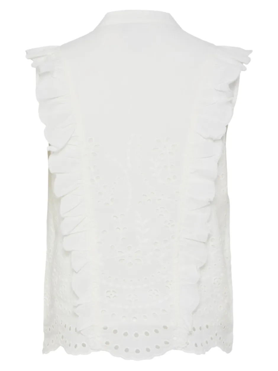 Tämä toppi on valmistettu herkästä broderie anglaise -kankaasta, jonka kankaassa on kauniita brodeerauksia.