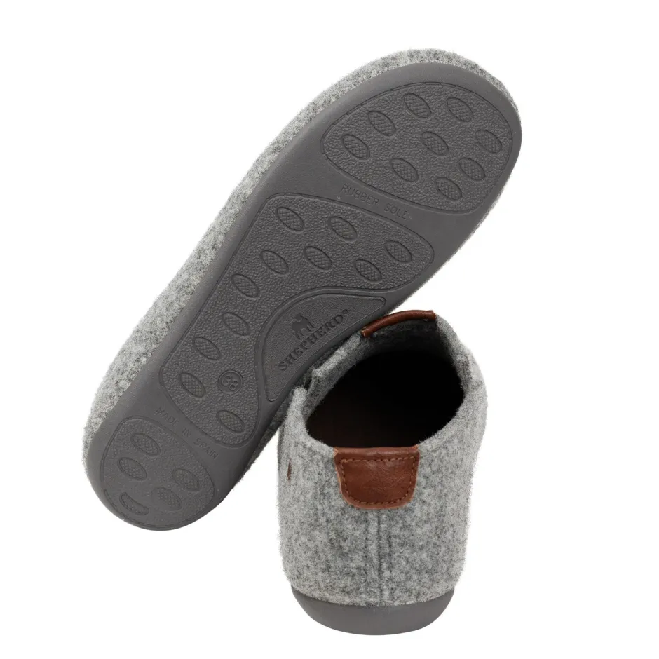 Shepherd Elma on matala nilkkakorkuinen luonnollisesta villasta valmistettu tossu, joka on pehmeä, lämmin ja helppo pukea sivuilla olevien halkioiden ansiosta. Hillityt nahkaiset yksityiskohdat ja sivulla oleva logo antavat yksilöllisen ilmeen.