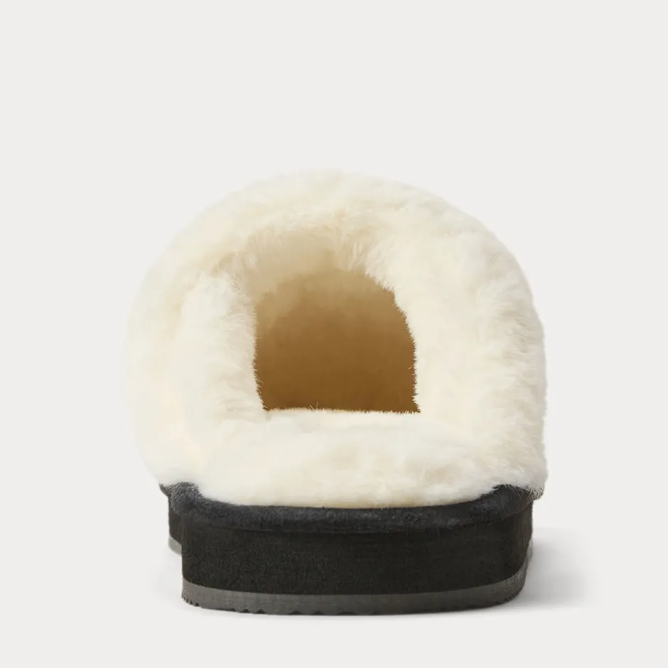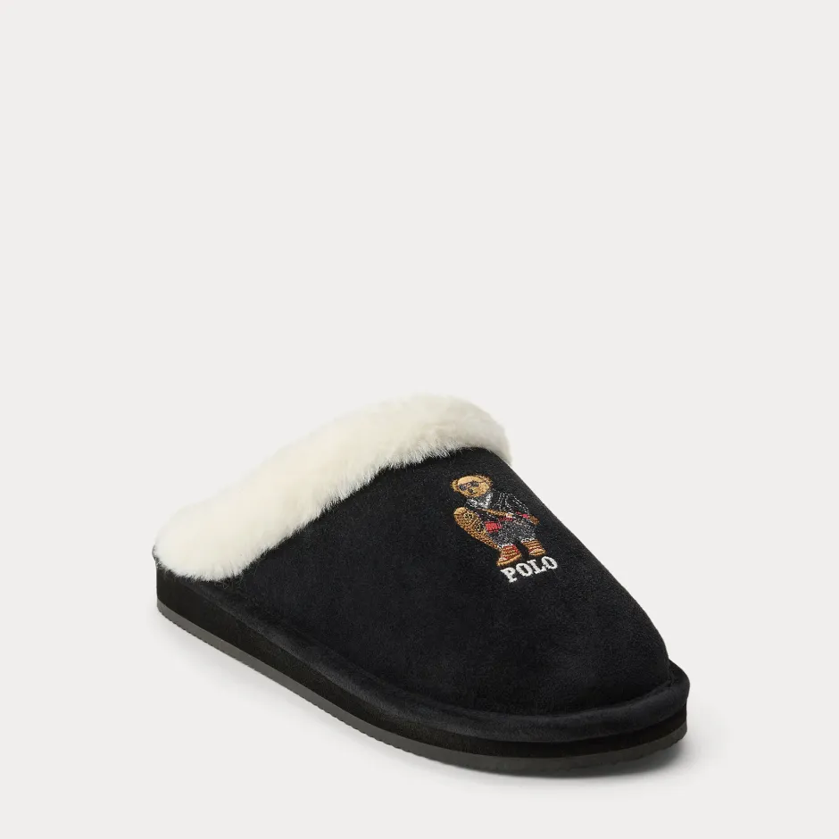 Nämä tohvelit on valmistettu mokkanahkapäällisestä ja vuorattu pehmeällä tekoturkiksella. Tohveleissa on pehmustettu sisäpohja ja kuvioitu ulkopohja, ja niissä on brodeerattu poolokarhukirjailu jalkapöydän kohdalla.