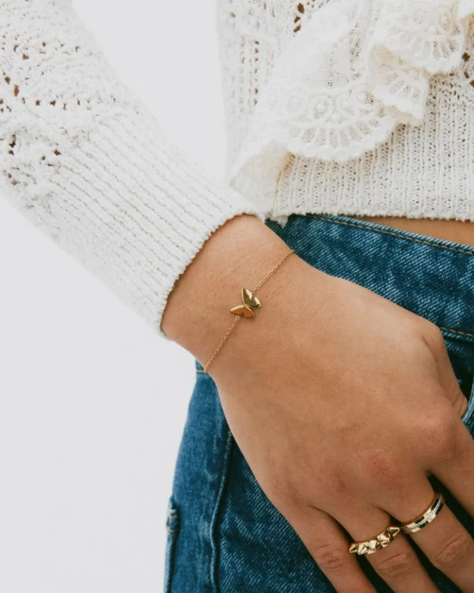 Papillon Bracelet Gold on kaunis ja ajaton rannekoru, jossa kiiltävä pieni perhinen. Ketjun pituus on säädettävissä 15,5–18,5 cm, joten se sopii monenlaiseen ranteeseen.