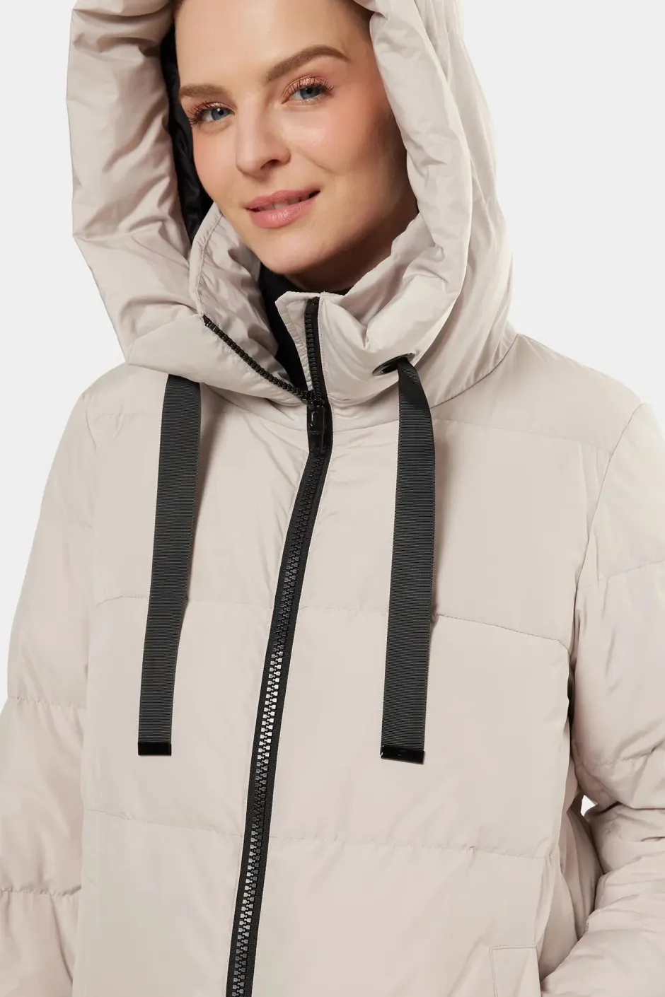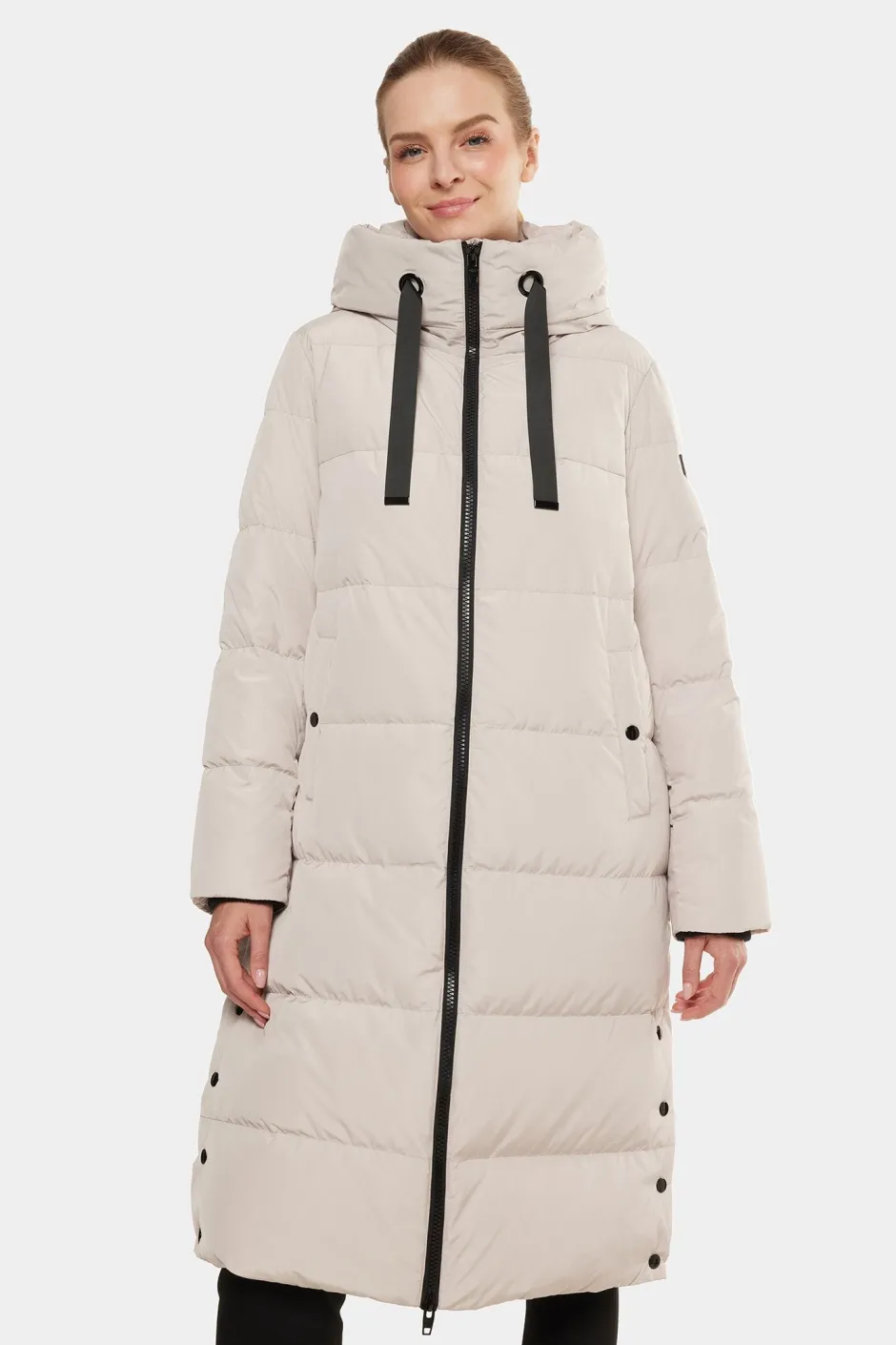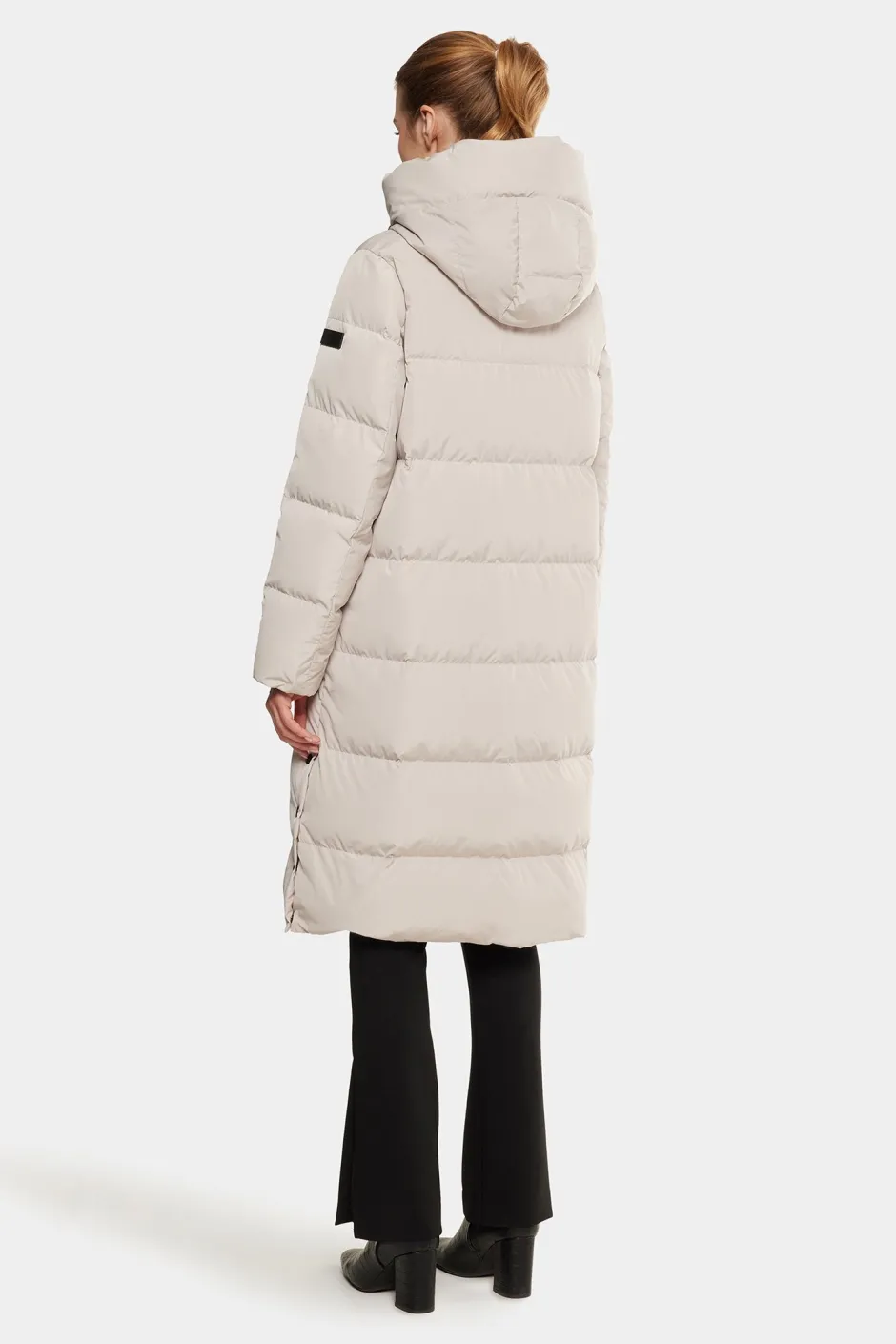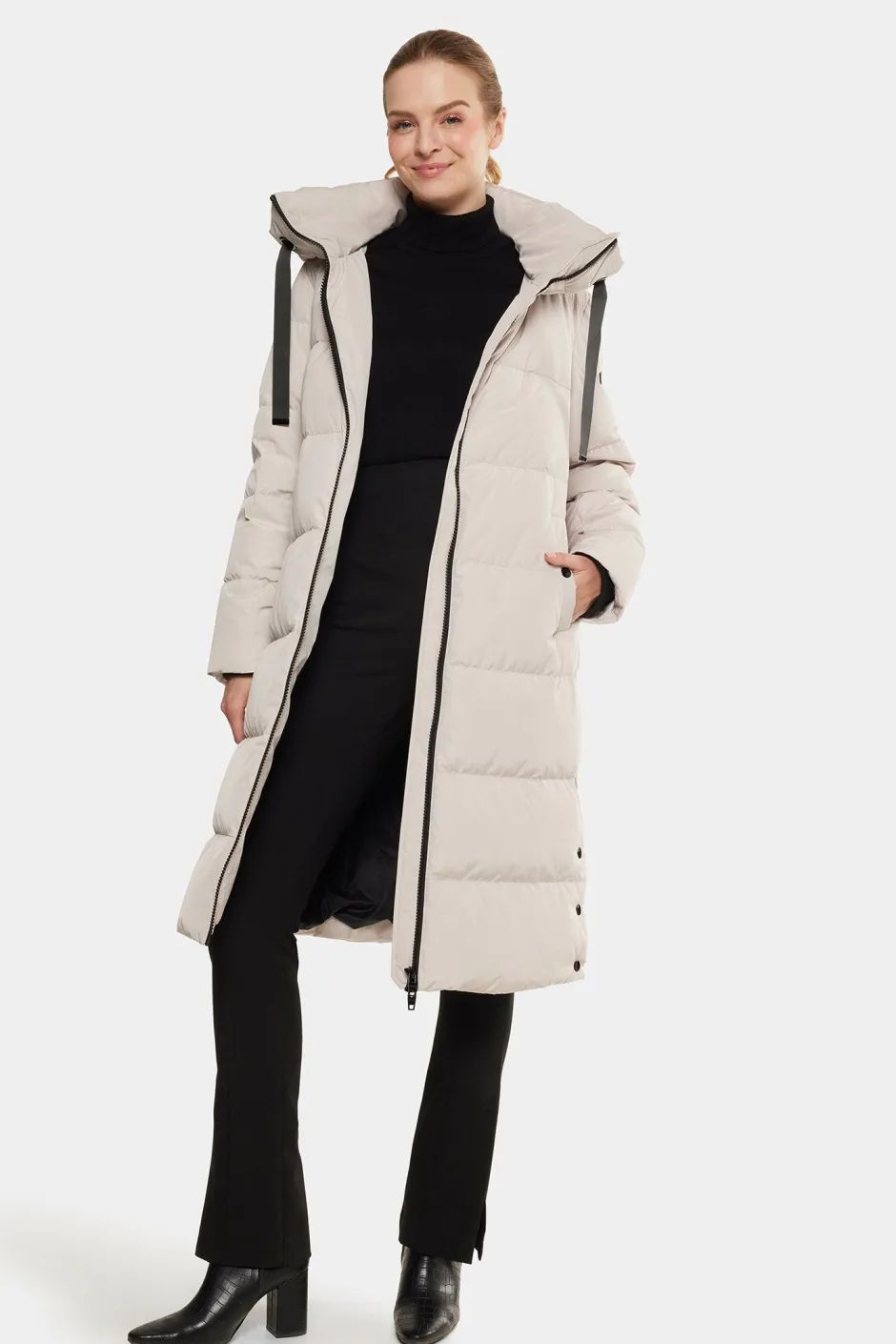 Camila on pitkä, topattu untuvatakki, joka on suunniteltu pitämään sinut lämpimänä vaivattoman tyylikkäästi. Siinä yhdistyvät sporttinen siluetti ja harkitut yksityiskohdat – viistot etutaskut nappikiinnityksellä, tyylikäs vetoketju edessä, ribbiresorit hihansuissa ja napitetut sivuhalkiot lisäävät joustavuutta. Korkea kaulus ja mukava huppu säädettävillä kiristysnyöreillä tekevät siitä jokapäiväisen talvivaateen – jossa muoti kohtaa toiminnallisuuden.