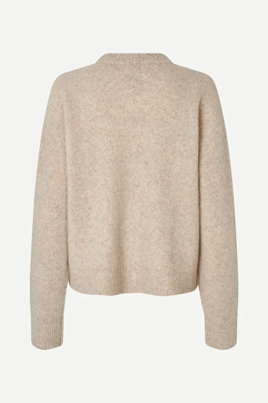Väljä neulepusero, jossa on madalletut olkapäät. Ribattu kaulus, hihansuut ja helma. V-pääntie. Päämateriaali on joustavaa sekoitetta, jossa on myös villaa.