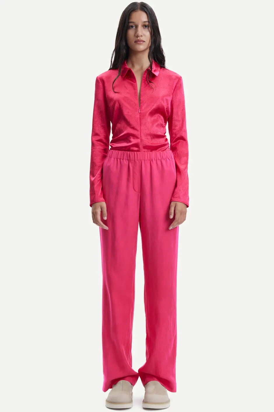 Samsoe and Samsoe naisten suorat housut. Suoralahkeiset housut joissa normaali istuvuus ja joustava vyötärönauha. Sivusaumoissa taskut. Sisälahkeen pituus koossa S = 83cm.