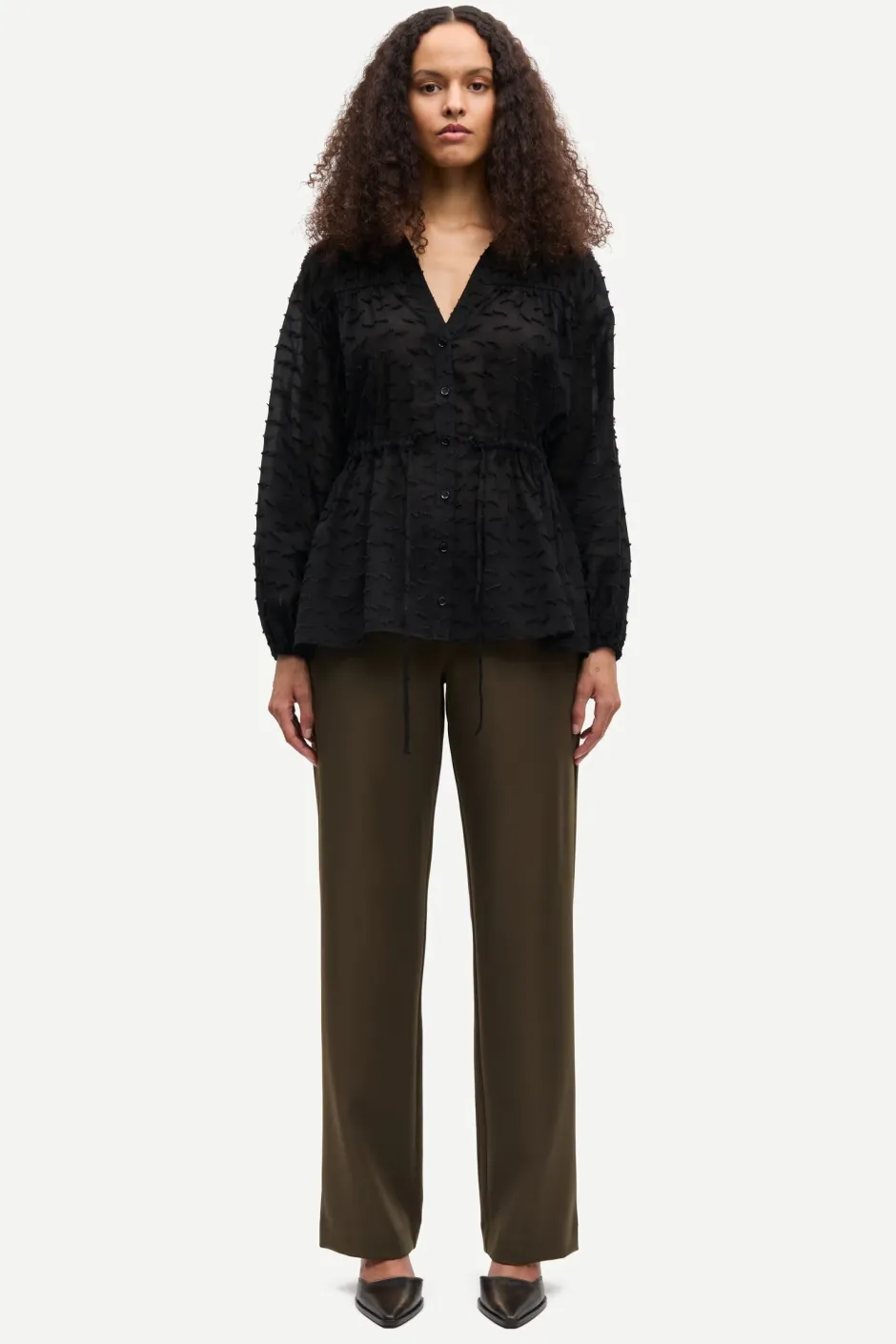 Malli on 179 cm pitkä ja käyttää kokoa S.”>Housut, joissa normaali istuvuus ja suorat lahkeet. Joustava vyötärönauha. Sivuilla halkiotaskut edessä ja takana teretasku. Päämateriaali on valmistettu joustavasta kierrätetystä polyesterisekoitteesta. Tämä tuote on GRS-sertifioitu. Jokainen toimitusketjun vaihe on täyttänyt tiukat sosiaaliset, ympäristölliset ja kemialliset vaatimukset. Sisäsauman pituus on 83 cm koossa S.