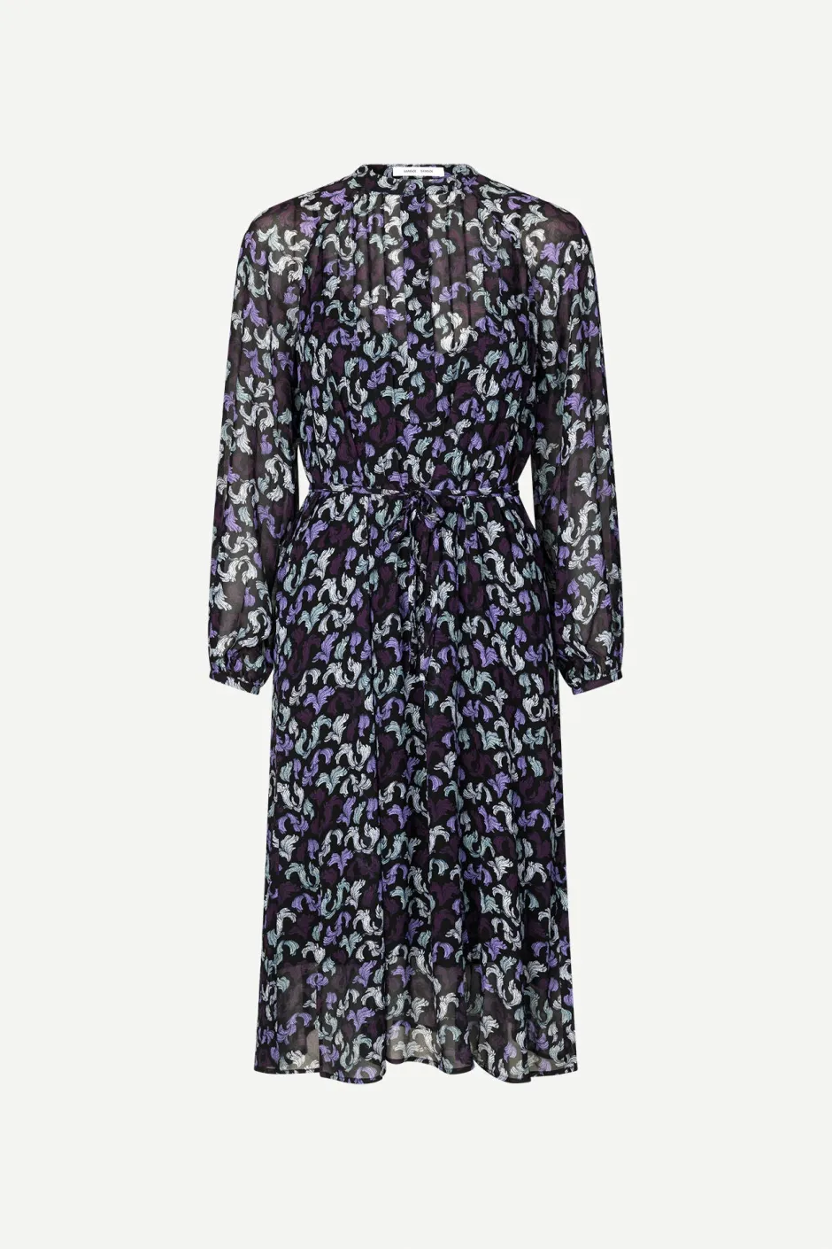 Löysästi istuva midi-mittainen mekko, jossa on pitkät hihat. Etuosassa piilopainonapitus ja rintakehällä pintuck-yksityiskohdat. Vyöllä korostettu vyötärö, joka on kiinnitetty takaa vetoketjutunnelilla. Alusmekko, jonka olkaimia voi säätää. 100% viskoosista valmistettu kangas, jossa on painettu kuviointi.
