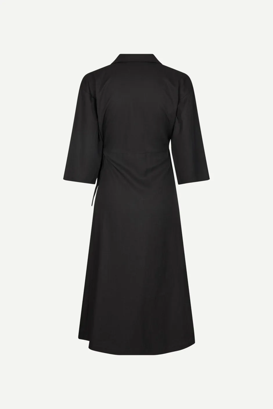 Regular fit istuvuuden midimekko. Vyötäröltä solmittava ja sisäpuolella nappikiinitys.