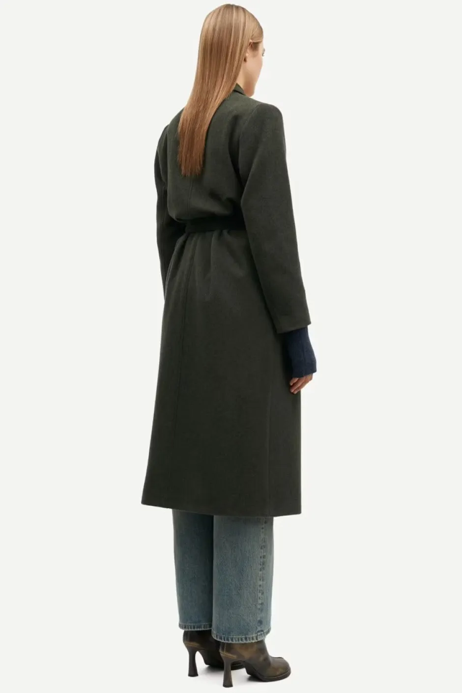 Tyylikäs pitkä villakangastakki. Edessä painonappikiinnitys. Viistotaskut ja sisätasku.