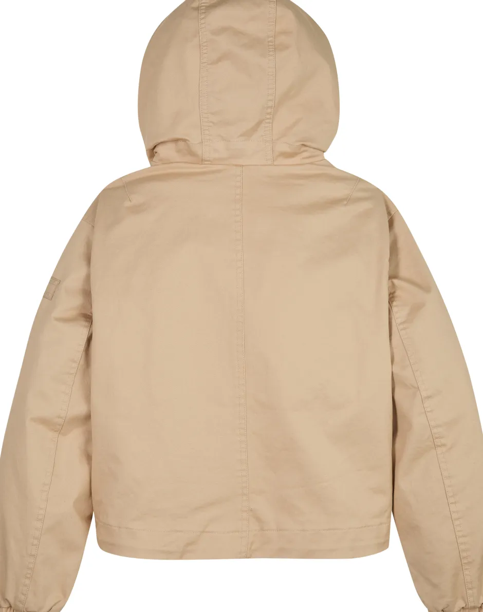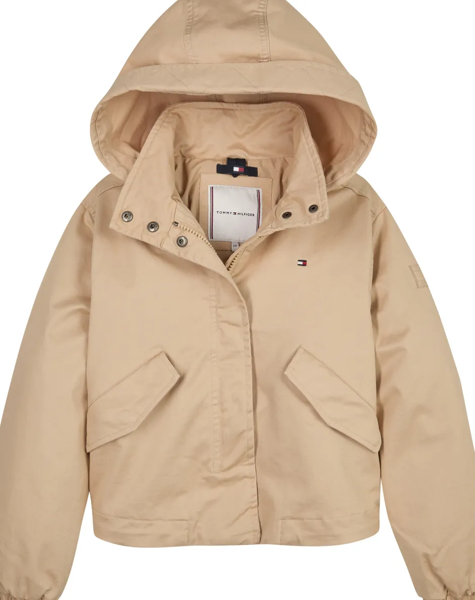 Tommy Hilfiger -takissa on kiinteä huppu, jossa on vääntösolki, joka kiinnitetään painonapeilla. Siinä on pitkät hihat, joissa on leveät joustavat reunat. Edessä kaksi taskua painonapeilla. Takissa on korkea kaulus painonapilla, ja takki avautuu täyspitkällä vetoketjulla,
