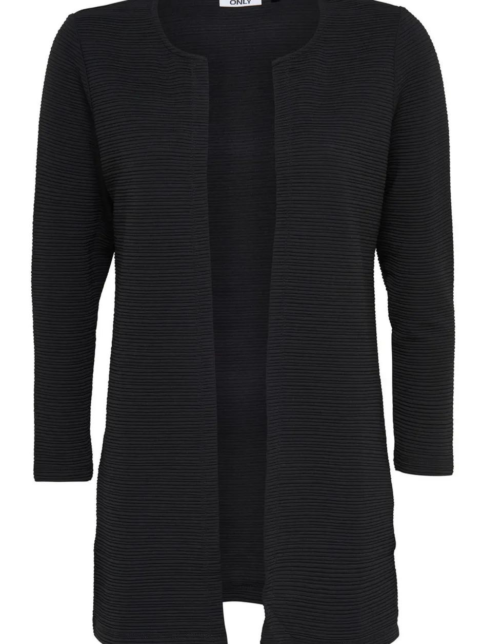 Only naisten trikootakki 7/8-hihoilla. Kankaassa raitastruktuuripinta, edestä avoin. Koossa S pituus n.72 cm.