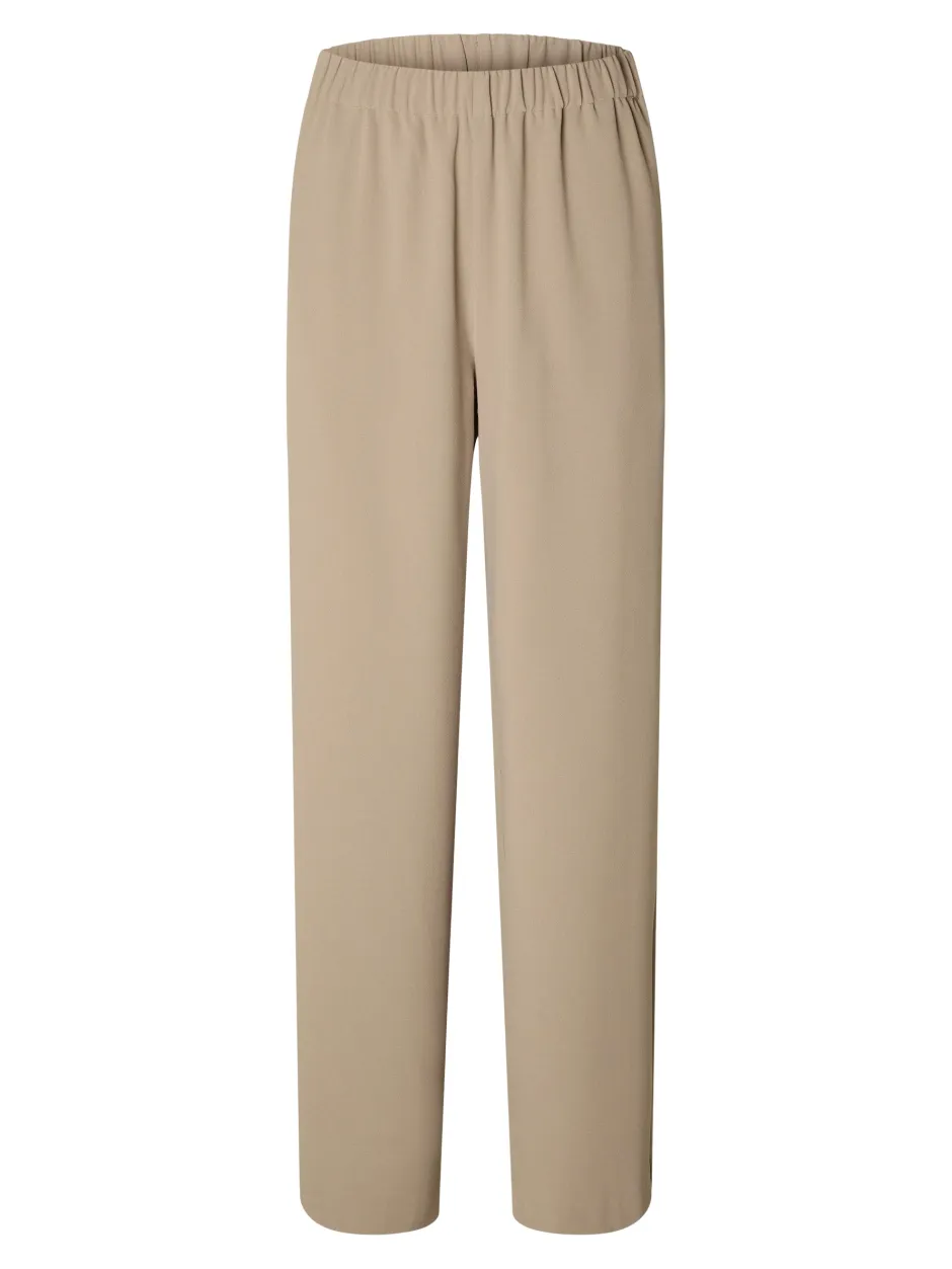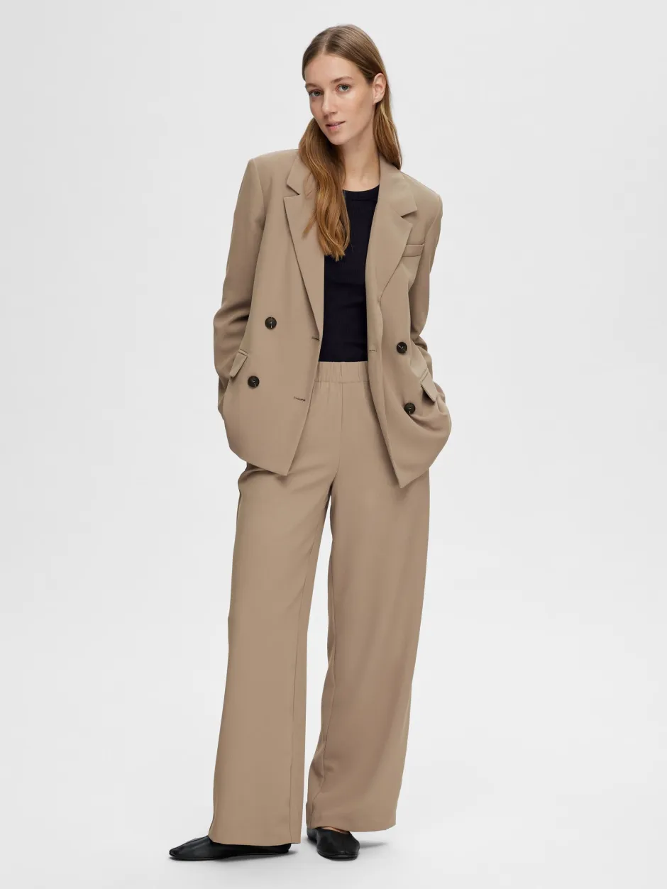 Selected Femme naisten leveät housut joustavalla keskikorkealla vyötäröllä. Taskut sivusaumoissa, rento istuvuus jossa tilaa liikkua.