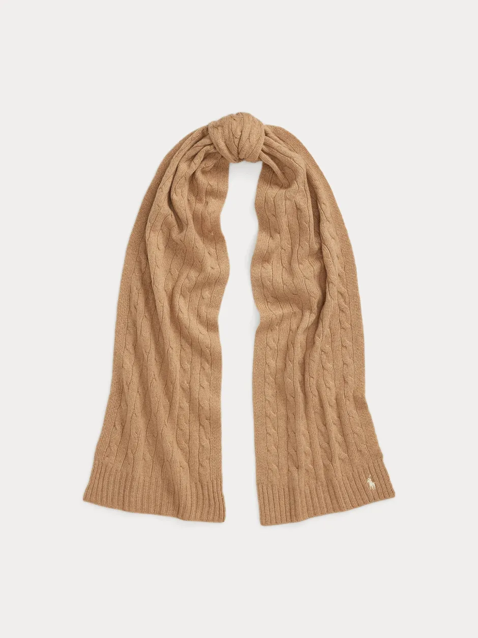 Ylellisestä villan ja kashmirlangan sekoituksesta valmistetussa huivissa on Ralph Laurenille tyypillinen palmikkoneulos, ja sitä korostaa kirjailtu poni-kuviomme.