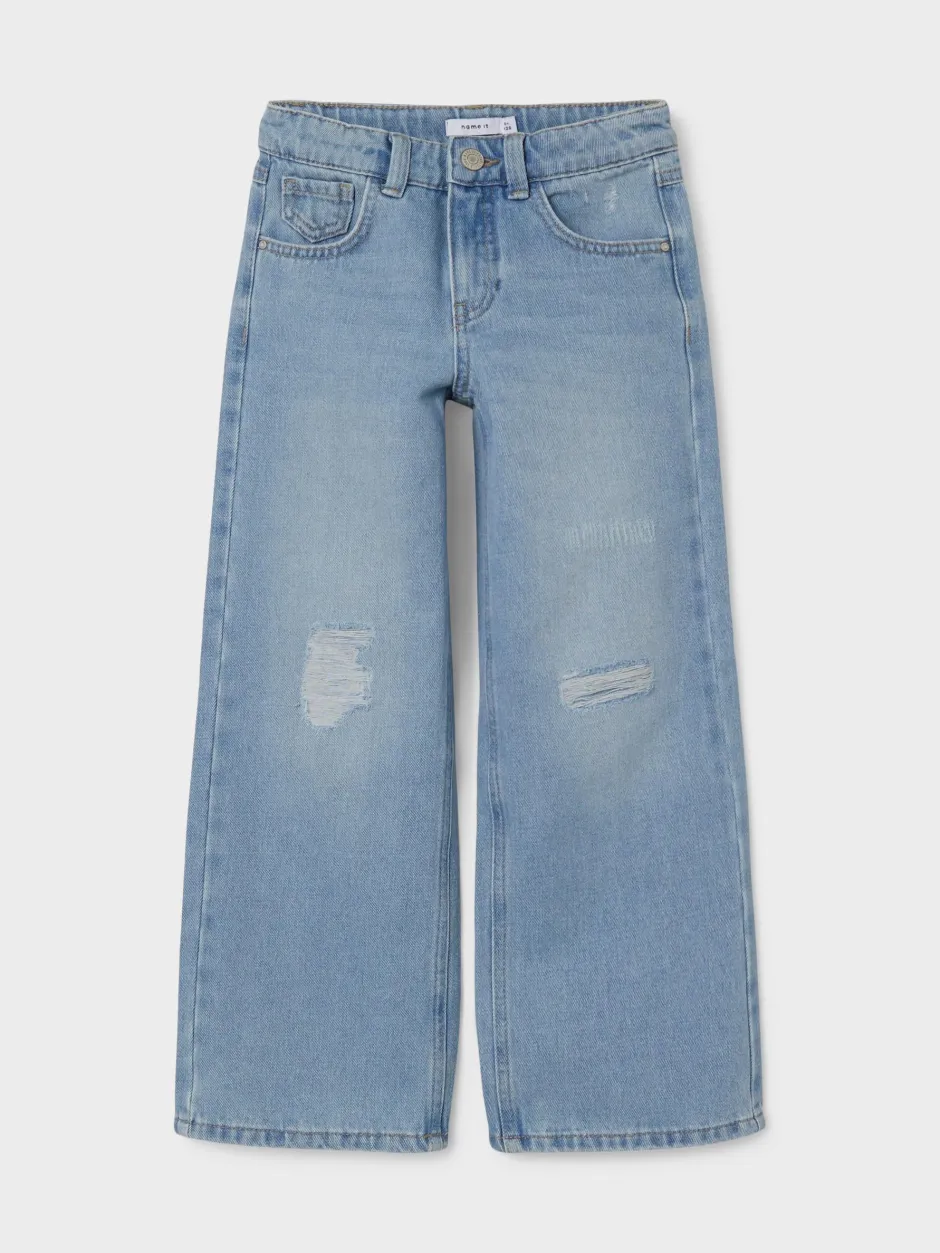 Lasten leveälahkeiset farkut, jotka on valmistettu puuvillasekoitteesta. Lahkeissa kulumaa. Klassinen 5-taskumalli