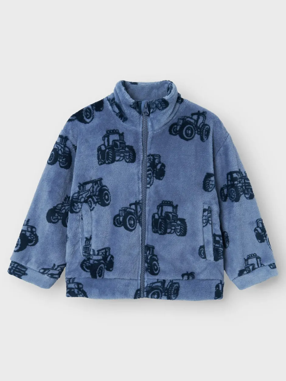 Pehmeä fleece-takki Name It -mallistosta, jossa hauska traktorikuvio tuo asuun leikkisyyttä. Takissa on pitkät hihat ja käytännöllinen vetoketju, mikä tekee siitä ihanteellisen kerrospukeutumiseen viileämmillä säillä.
