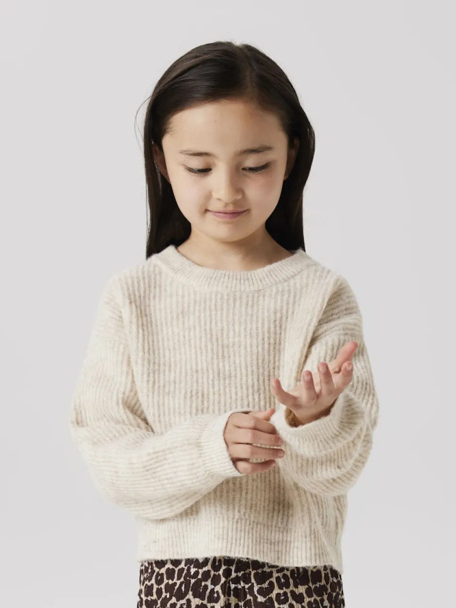 Neuleessa on pyöreä pääntie, pitkät hihat, pudotetut olkapäät ja resorilliset hihansuut.
