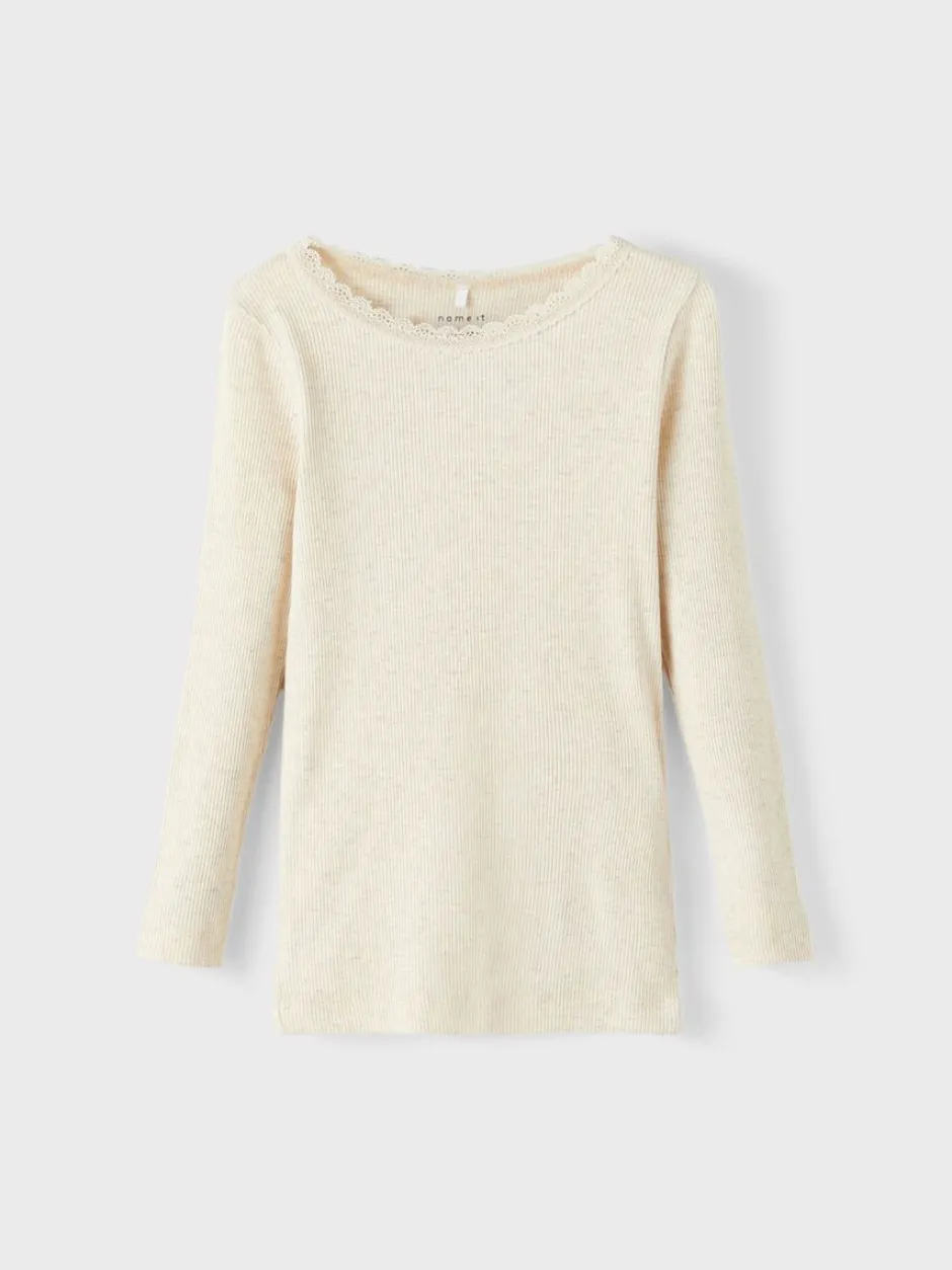 Name It lasten pitkähihainen paita. Paidan pääntiellä kapea pitsi yksityiskohtana.
