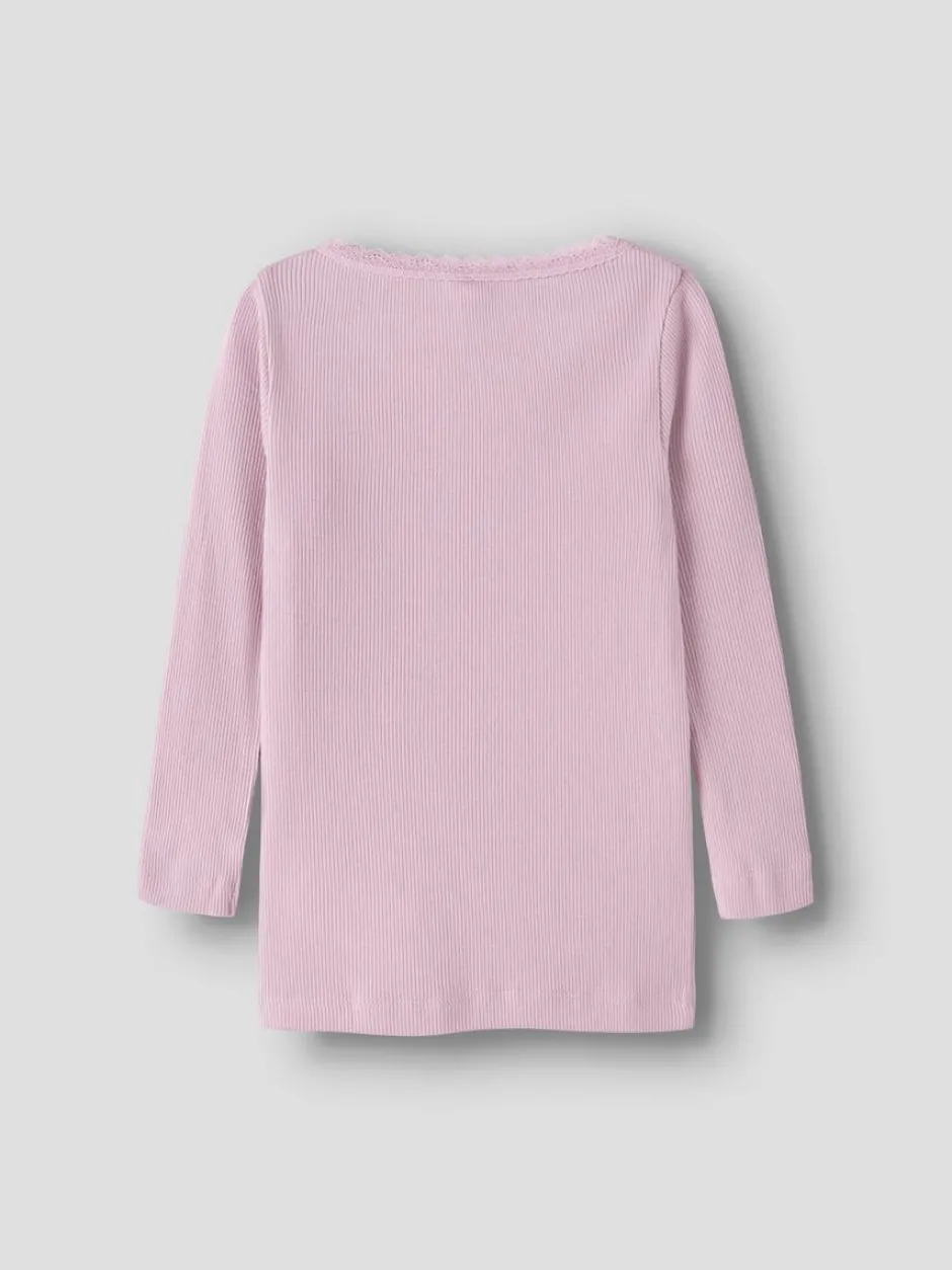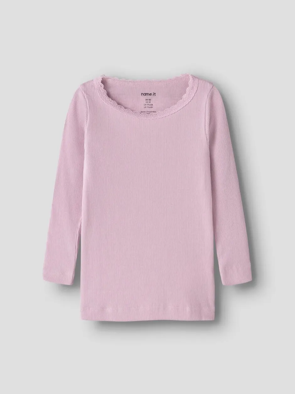 Name It lasten pitkähihainen paita. Paidan pääntiellä kapea pitsi yksityiskohtana.
