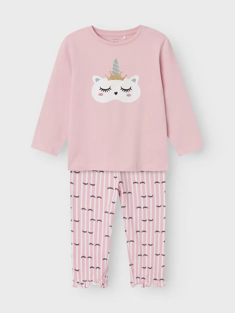 – Tuotetyyppi: pyjamasetti – Kuosi: tuotteessa kauttaaltaan toistuva kuosi – Printti: pehmeä kumiprintti – Hihat: pitkät hihat – Muut yksityiskohdat: joustava vyötärö – Muut yksityiskohdat: röyhelöt – Muut yksityiskohdat: glitteryksityiskohta – Muut yksityiskohdat: brodeeraus