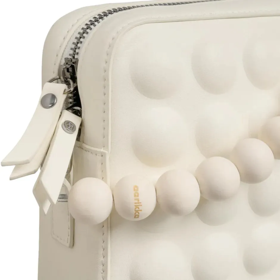 Pop-olkalaukku Auri on valmistettu kohokuvioidusta nahasta ja suljetaan vetoketjulla, joka takaa turvallisen säilytyksen. Laukun sisäpuoli on vuorattu jakardikuvioidulla kankaalla, ja siinä on kätevä sisätasku. Laukussa on säädettävä ja irrotettava olkahihna sekä irrotettava käsihihna. Käsihihnaa koristavat Aarikan ikoniset puuhelmet.