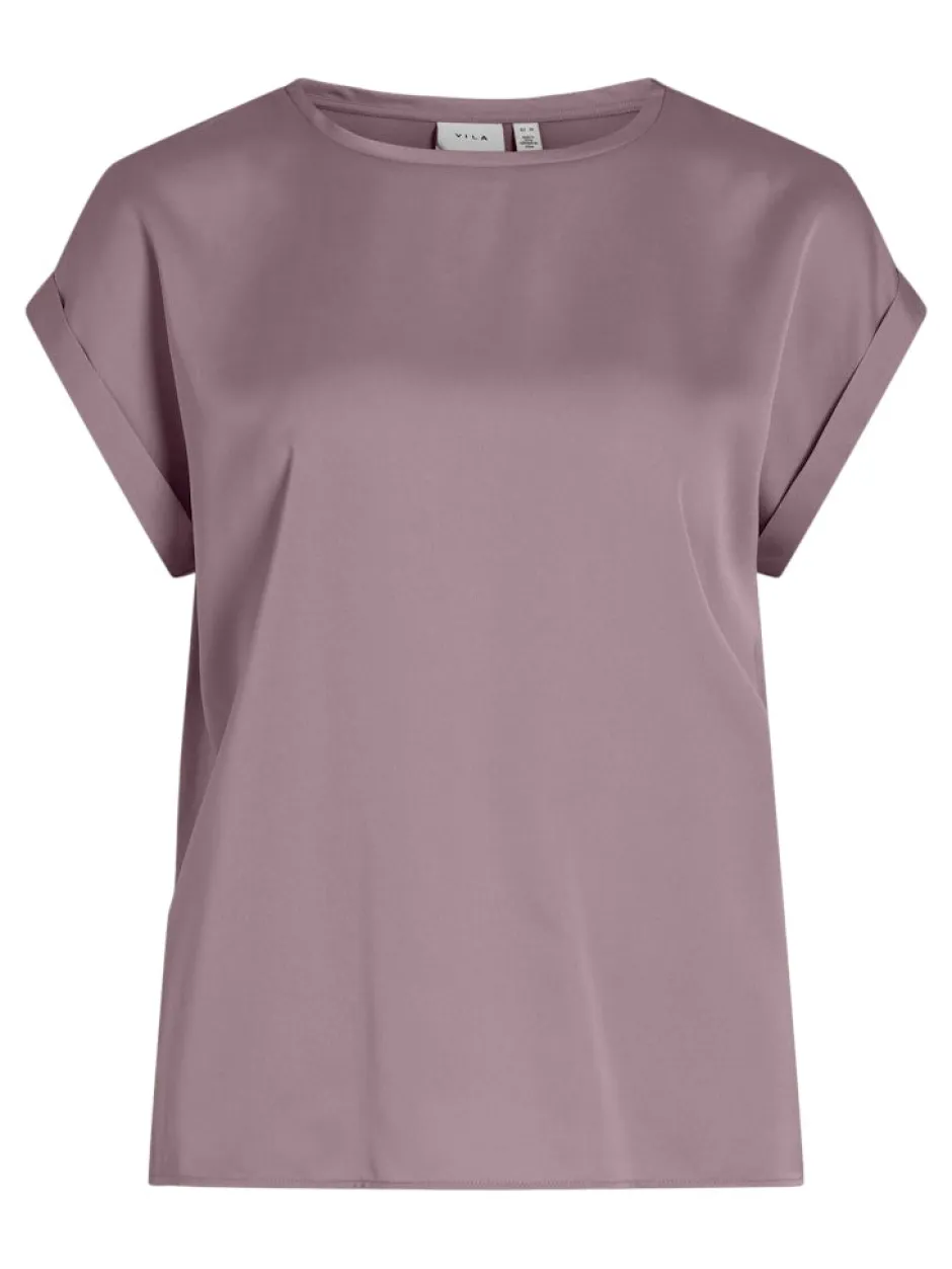 – Lyhythihainen toppi, jossa on pyöreä kaula-aukko – Satiinimainen pinta – Kevyttä materiaalia – Joustamatonta materiaalia – Pituus: 61 cm (koko 38) – Hihojen pituus: 11 cm (koko 38) – Malli on 178 cm pitkä, yllä koko 38.
