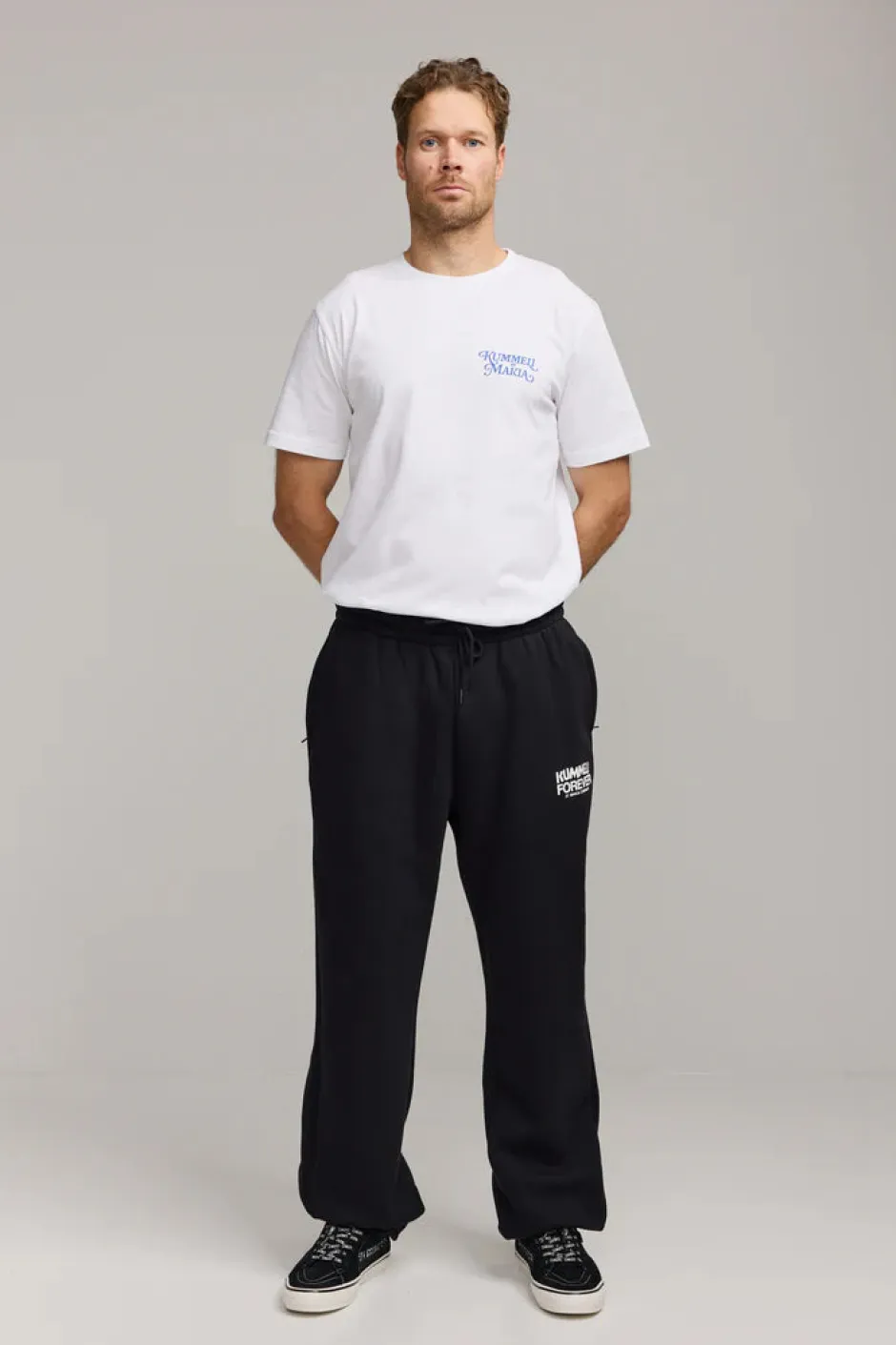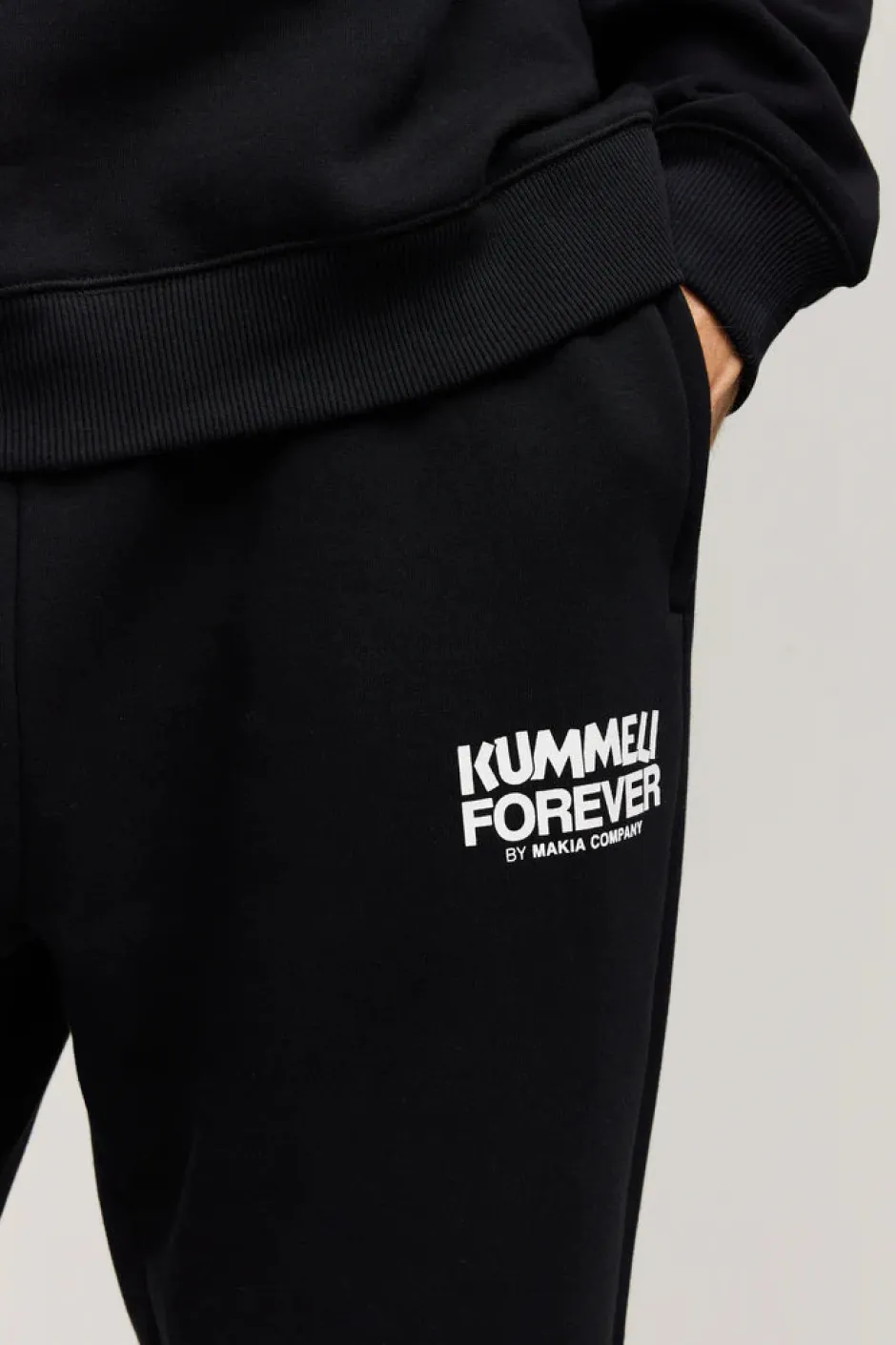 Kummeli Forever by Makia -malliston collegehousut, joissa Kummeli Forever -printti.