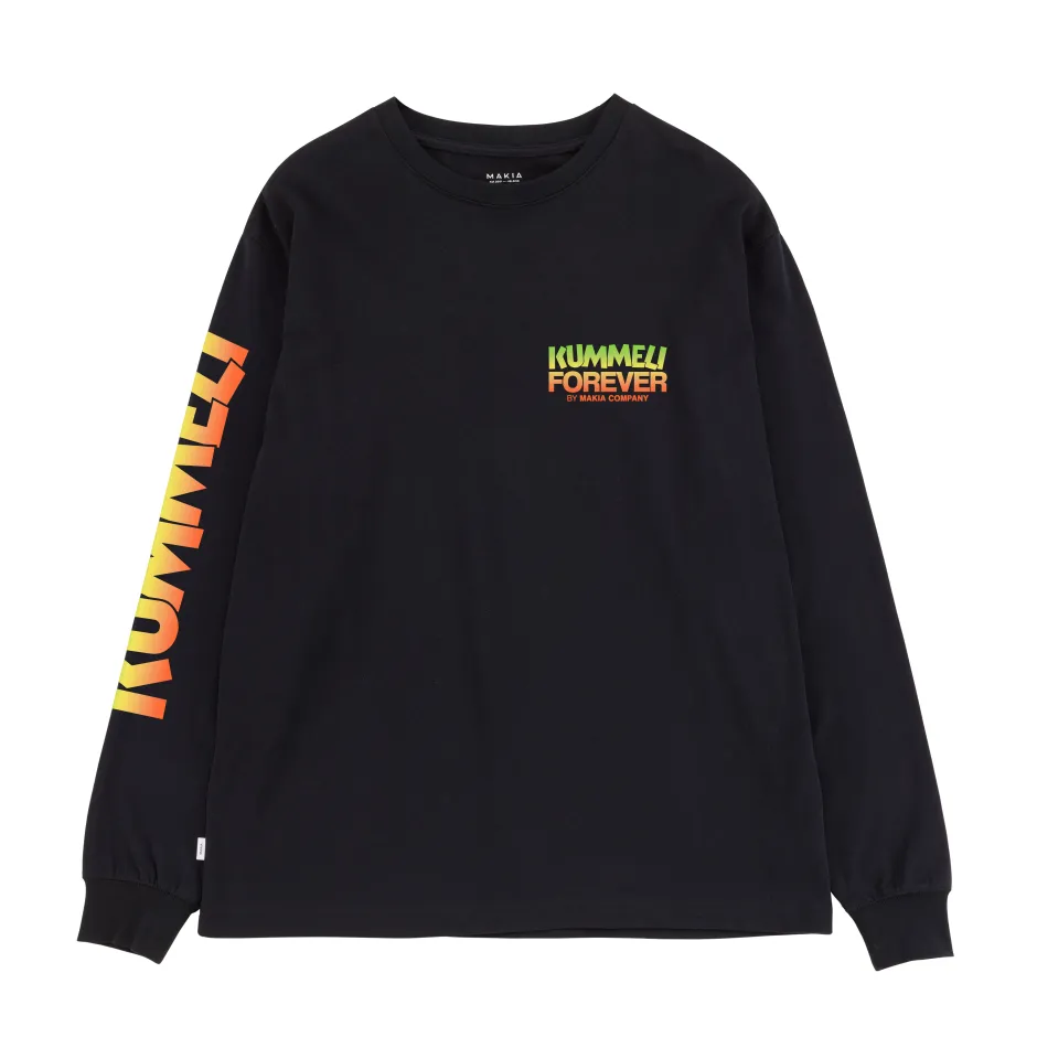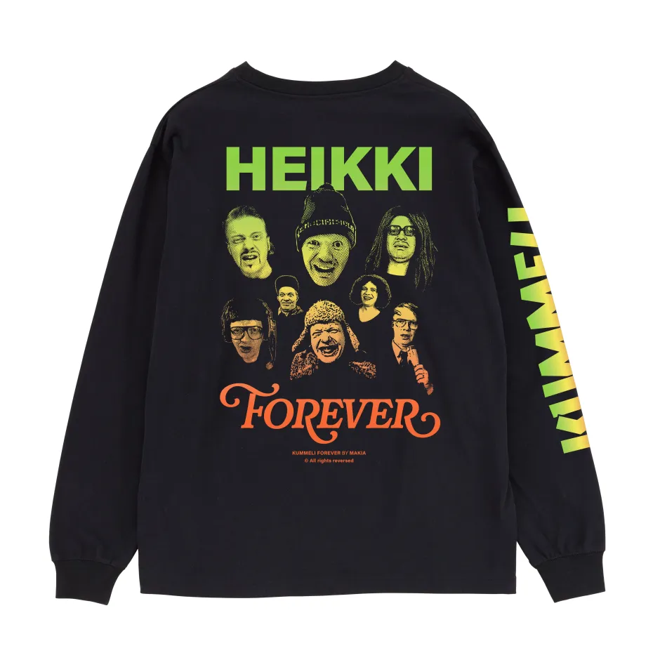 Kummeli Forever by Makia -malliston puuvillainen, pitkähihainen t-paita, jossa näyttävät Heikki-printit selässä ja hihoissa, sekä printti rinnassa. Paidassa pitkät hihat ja pyöreä pääntie. Hihansuissa ja pääntiellä joustavat resorit.