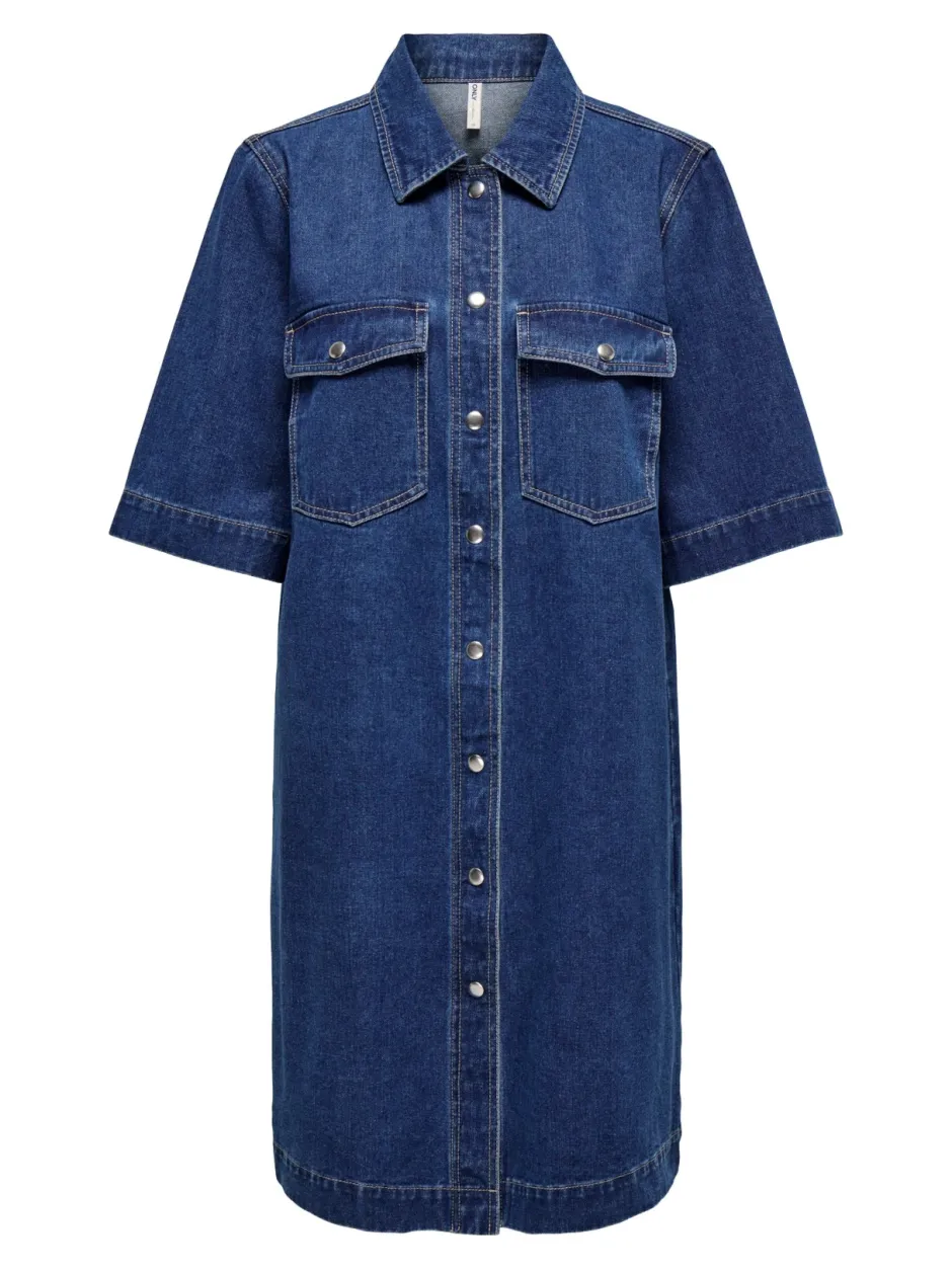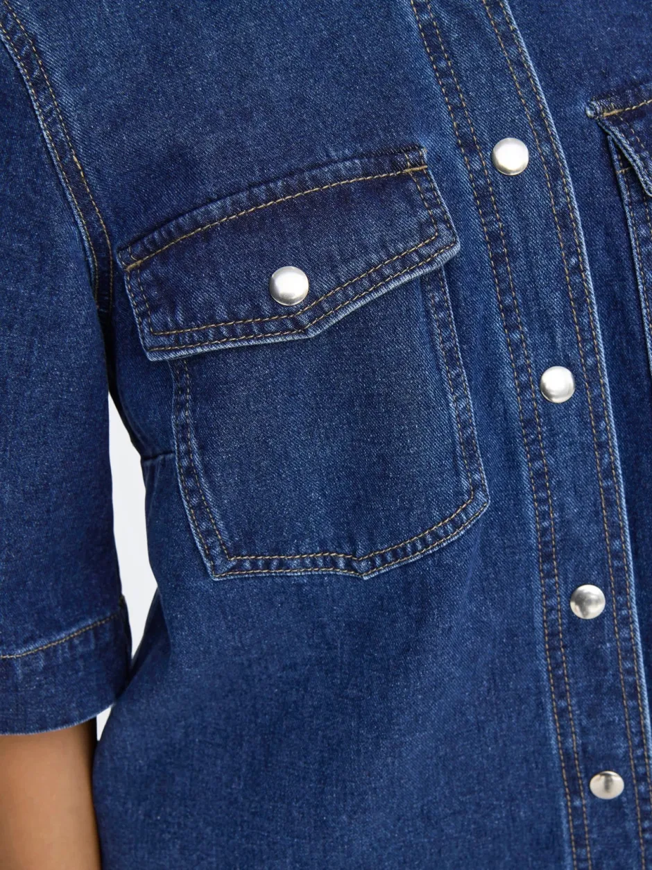 Valmistaudu töihin, kouluun tai vapaa-ajan menoihin farkkumekolla, joka yhdistää ajattoman tyylin ja käytännöllisyyden. Pehmeä ja hengittävä puuvilla tuntuu miellyttävältä päällä, ja mekko on helppo yhdistää erilaisiin asusteisiin. Lyhyt Regular fit -malli, rintataskut ja painonappikiinnitys tekevät mekosta toimivan ja tyylikkään valinnan arkeen. Hellävarainen denim-pesu tuo tuotteelle tumman ja modernin ilmeen.