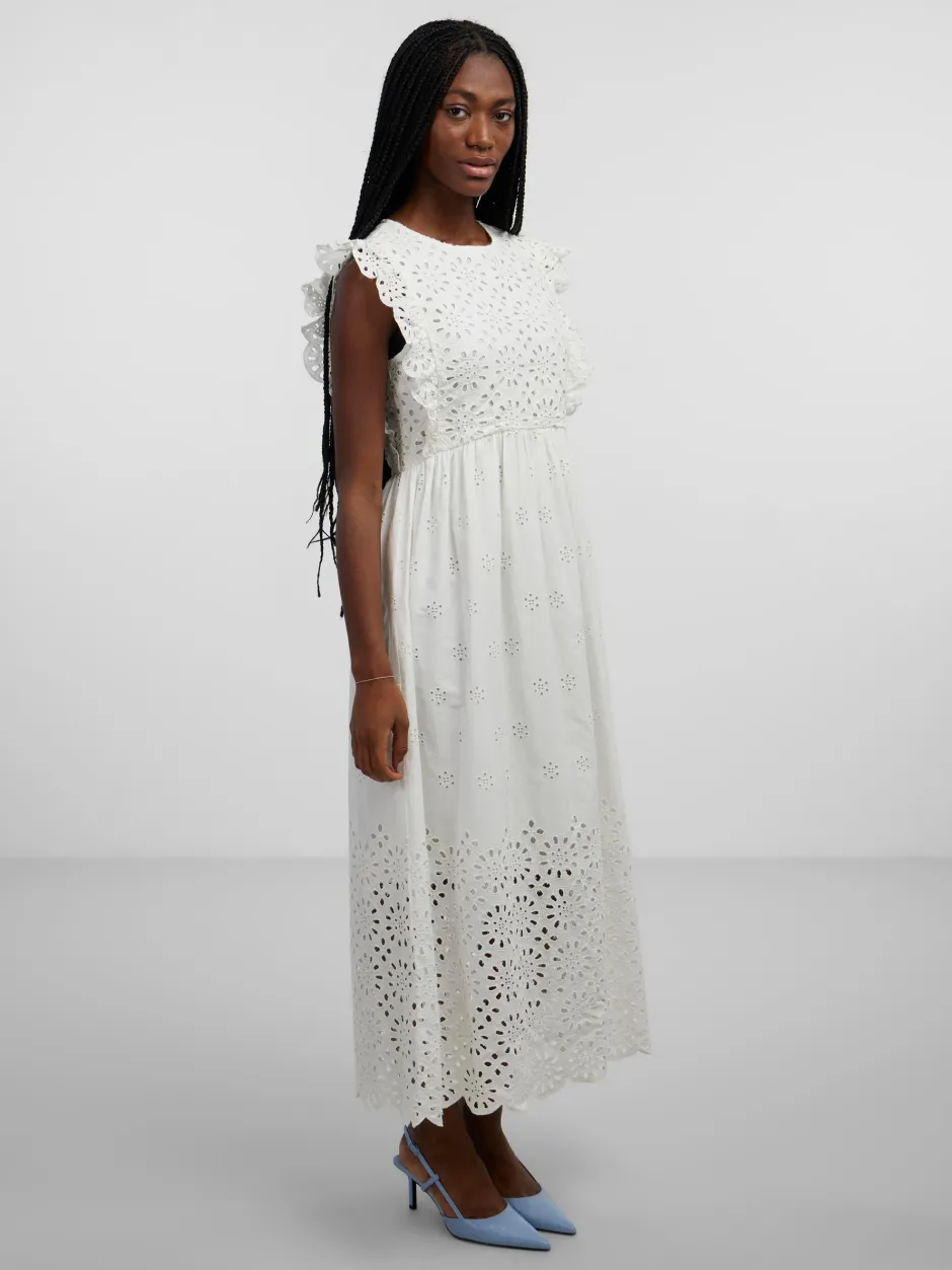 Lisäyksityiskohdat: Vyötäröllä leikkauslinja, röyhelöt naiselliseen reunaan, Broderie anglaise -yksityiskohta