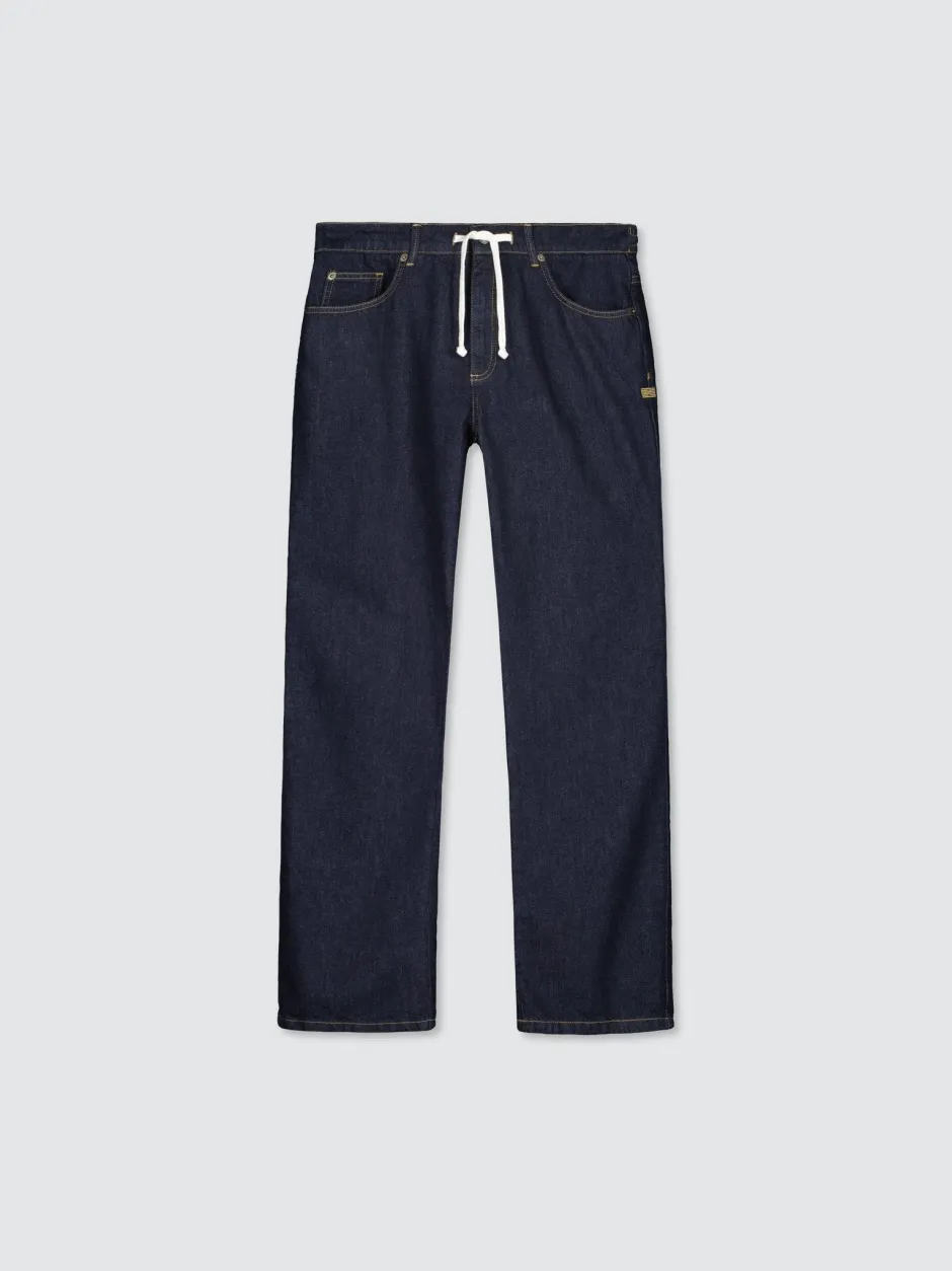 Rennot Billebeino-farkut, joissa on kiristysnyöri vyötäröllä istuvuuden säätöä varten. Tiilikuvioinen kirjonta sivusaumassa ja Billebeino-merkki takataskussa.