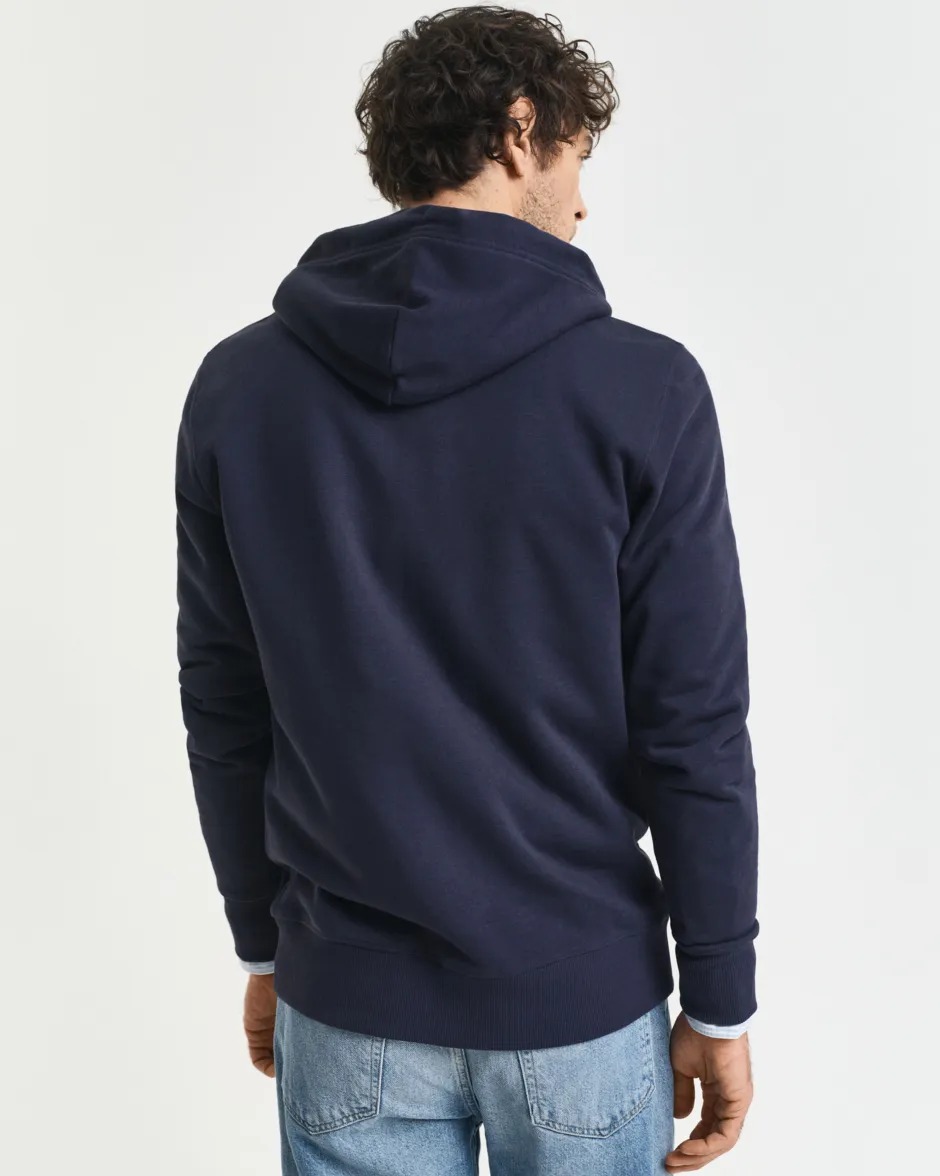 Hupparissa on pieni kirjailtu vaakunakuvio rinnassa, kokopitkä vetoketju sekä kengurutasku edessä.