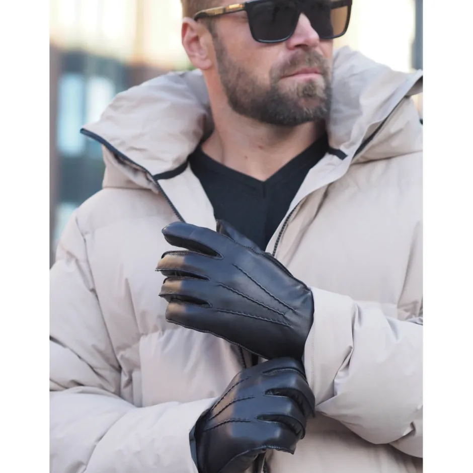 Miesten mustat lammasnappa käsineet, joissa varsi hieman pidempi, vasta sauma, rannekuminauha ja 3 käsin ommeltua koristeommelta päällipuolella. 100% villavuori.