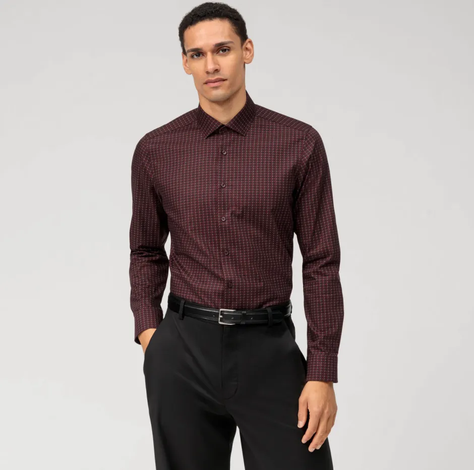 OLYMP Level Five -slim fit -Kauluspaita on nuorekas valinta. Comfort Stretch -twill-materiaali yhdistää muodonpitävyyden, helpon hoidon ja rohkean kuvioprintin sporttisella Modern Kent -kauluksella.