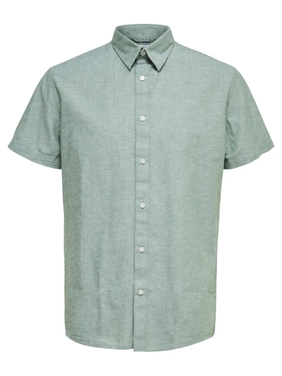Selected miesten kauluspaita, normaali mitoitus. Materiaali pehmeää ja vilpoista pellavan ja puuvillan sekoitetta.