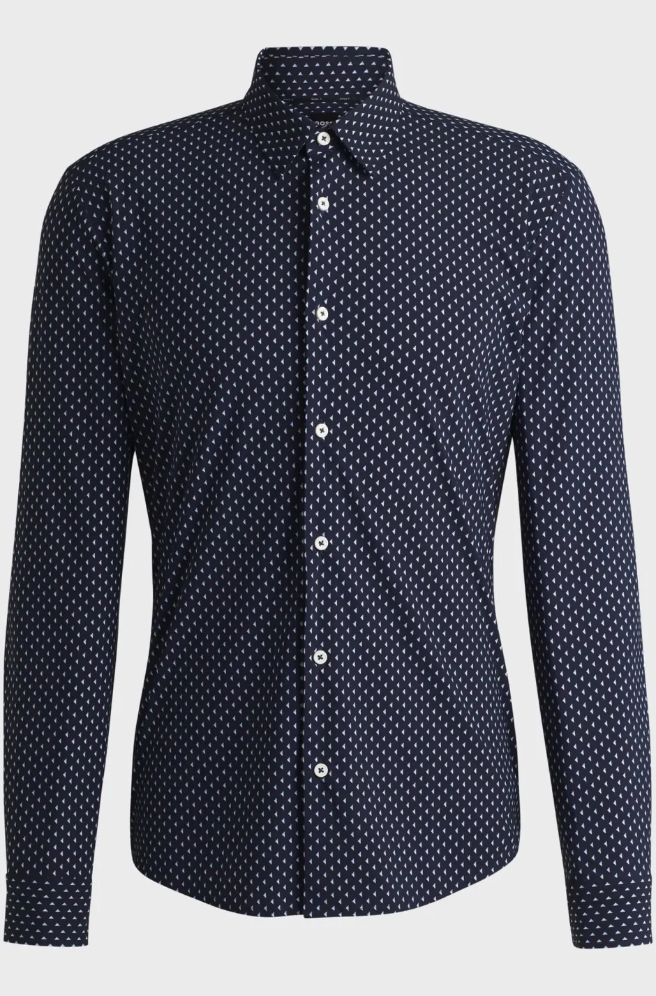 BOSS Menswearin dynaaminen paita, jossa yhdistyy suorituskykyinen joustava kangas ja moderni ohut istuvuus. Tämä kappale on painettu geometrisella kuviolla. Kumipäällysteiset napit.