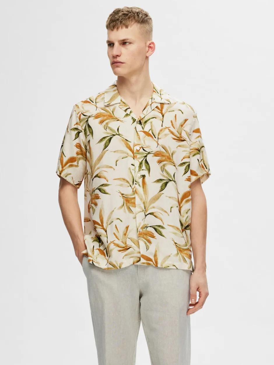 – Levitetty kaulus – Edessä napitus – Lyhyet hihat – Painettu muotoilu – Valmistettu pellavasta – Normaali istuvuus