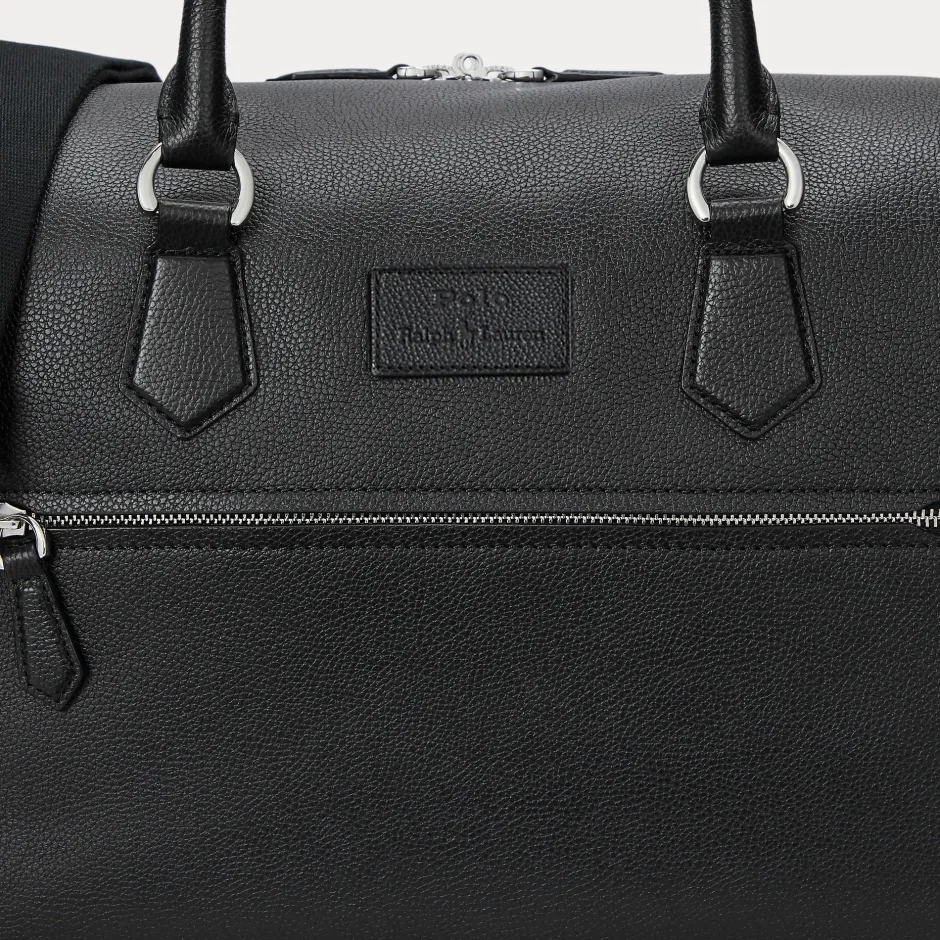 Kaksi nahkaista kantokahvaa, kummassakin 13 cm laskos. Irrotettava, säädettävä olkahihna. Kaksisuuntainen vetoketjukiinnitys päällimmäisenä nahkaisilla vetoketjun vetimillä. Vetoketjullinen etutasku. Sivussa vetoketjullinen kenkälokero. Vetoketjullinen sisätasku. Edessä Polo Ralph Lauren -logo ja tunnusomainen poni-merkki. Vahvistettu pohja. Vuorattu twillikankaalla. Mitat 35,4 cm K x 41,5 cm P x 18,2 cm S