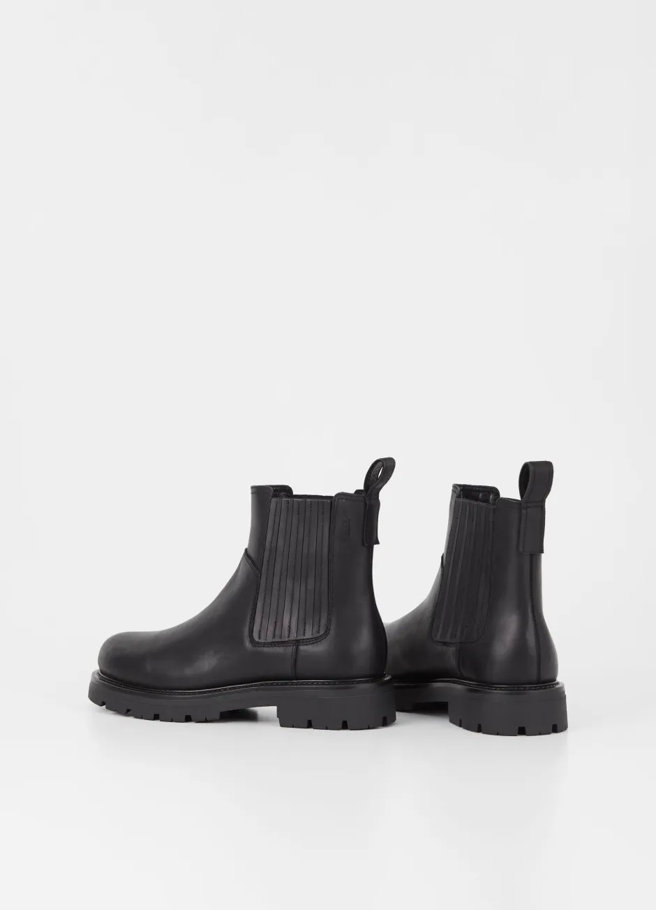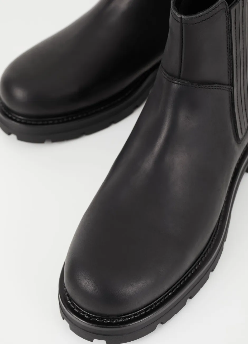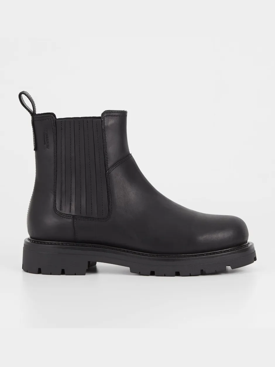 Cameron on lämminvuoriset Chelsea-nilkkurit arkiseen käyttöön. Tyyli on valmistettu luonnonmustasta öljytystä nupukista, jossa on lämmin vuori, joustavat sivupaneelit ja vetolenkit. Vankat korot ovat 40 mm.