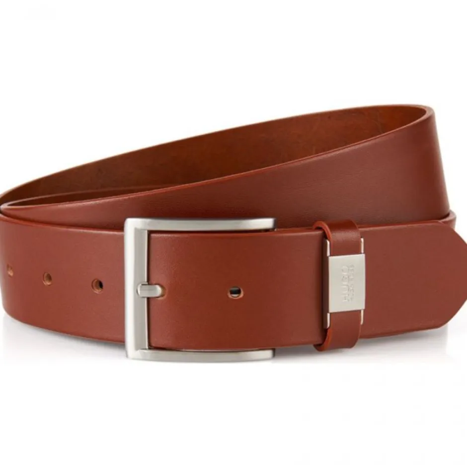 Hugo Boss nahkavyö, leveys 4 senttimetriä. Hopeanvärinen solki, vyönväriset tikkaukset.