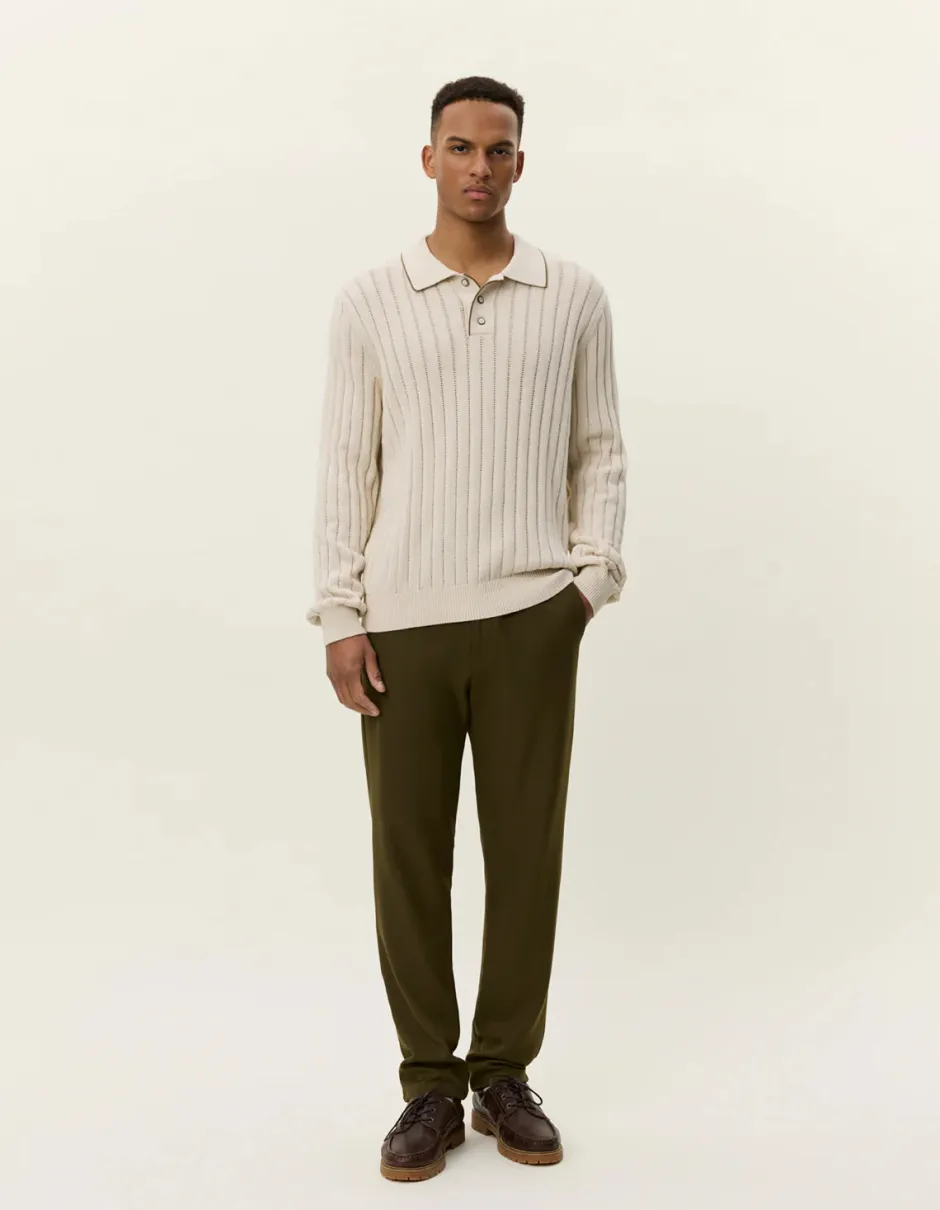 Kevyt, teksturoitu ja juuri sopiva. Bogart yhdistää arjen helppouden hienovaraiseen rakenteeseen pystysuorien raitojen ja kauluksen kontrastivärisen reunuksen ansiosta.