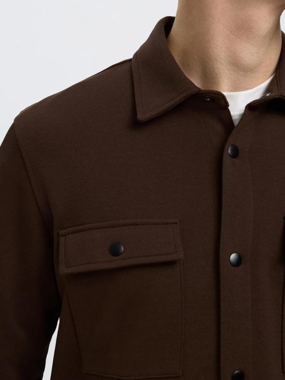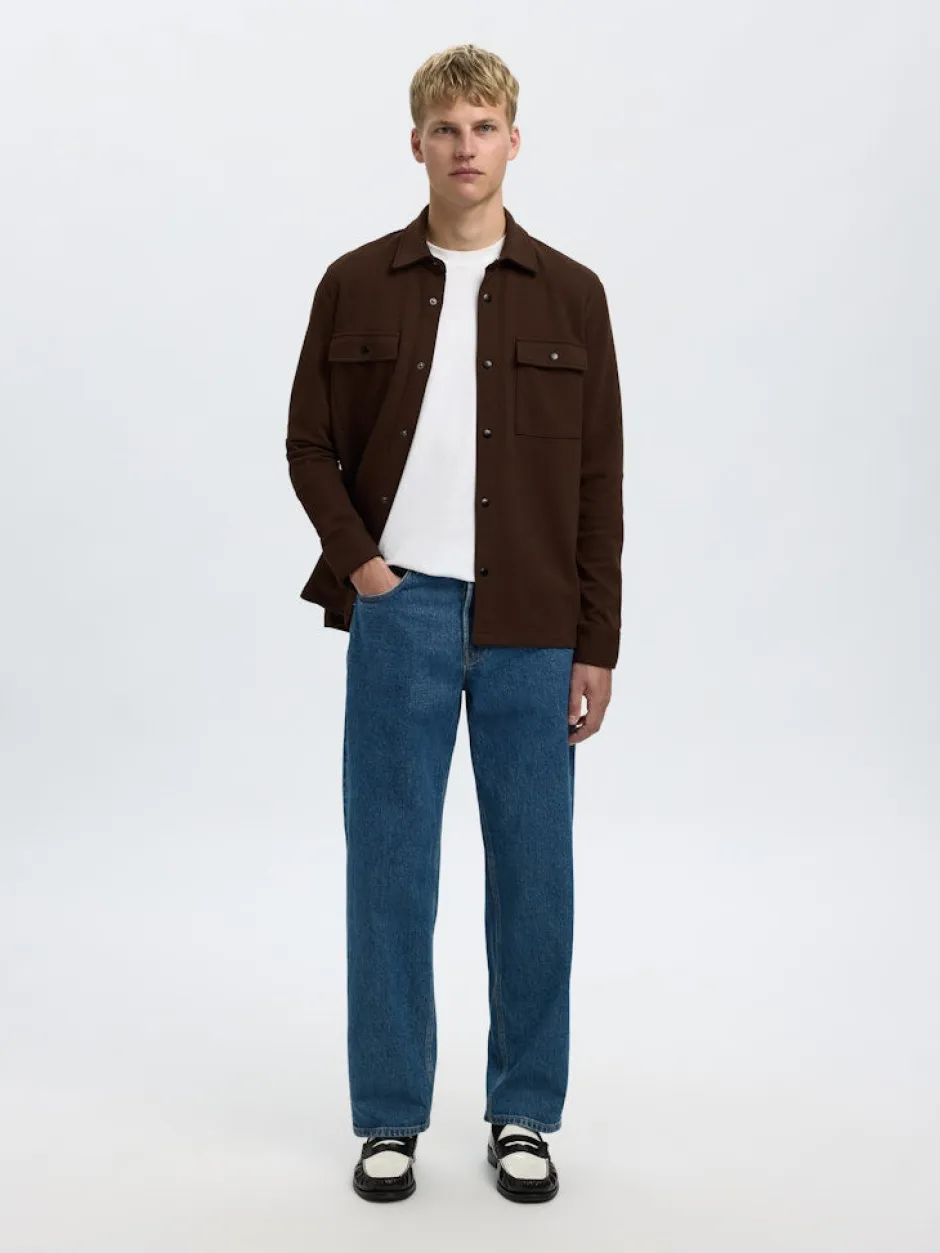 Selectedin rento ja trendikäs paitatakki. Kaulukset ja nepparikiinnitys edessä. Läpälliset rintataskut nepparilla. Materiaali joustavaa ja pehmeää luomupuuvillasekoitetta.