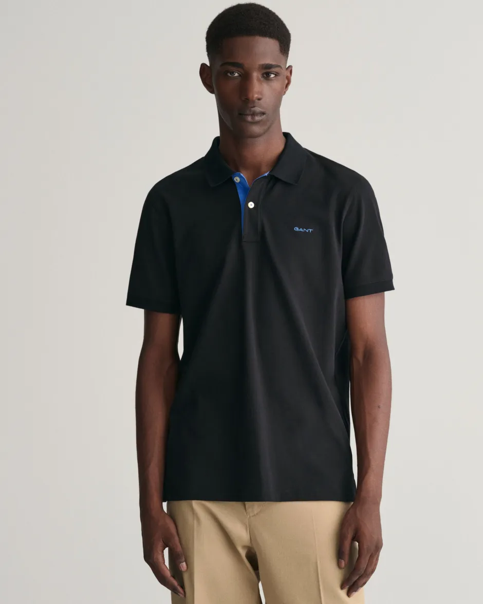 Gant miesten pehmeä, lyhythihainen pikeepaita kontrastivärillä. Resorikauluksen alapuoli ja nappilistan sisäpuoli erivärinen. Rinnassa brodeerattu logo, helmassa sivuilla lyhyet halkiot. Regular fit.