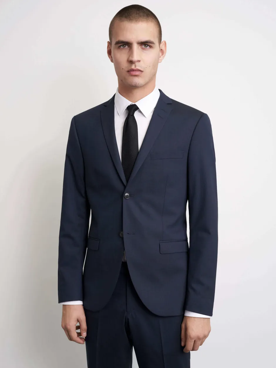 Miesten puvuntakki. Edessä kaksi nappia takin sulkemiseen. Edessä suorat läpälliset taskut. Takki on vuorillinen. Takana sivuhalkiot.