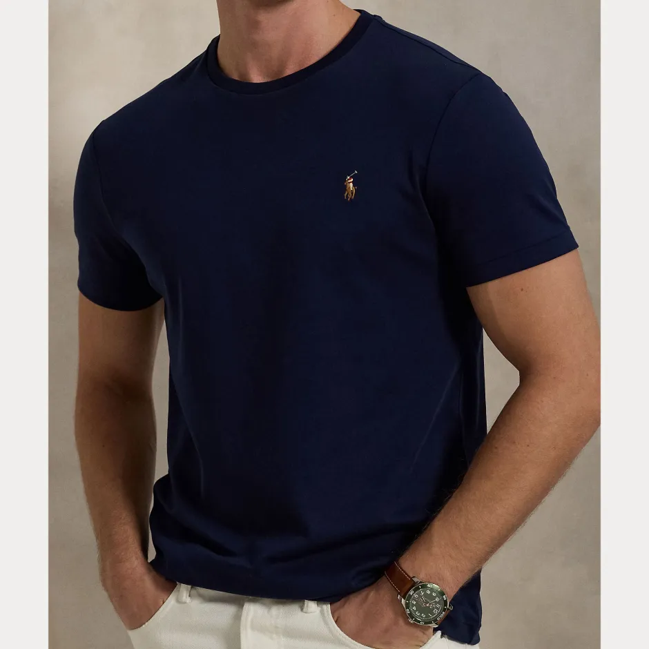 Polo Ralph Laurenin tummansininen t-paita on valmistettu 100 % pehmeästä puuvillasta, joka tarjoaa hengittävän ja miellyttävän käyttökokemuksen. Klassinen pyöreä pääntie, lyhyet hihat ja regular fit -istuvuus tekevät siitä monikäyttöisen arjen luottovaatteen. Pienikokoinen, tunnistettava Polo Pony -logo rinnassa viimeistelee ikonisen ilmeen.