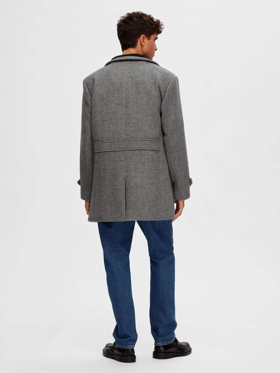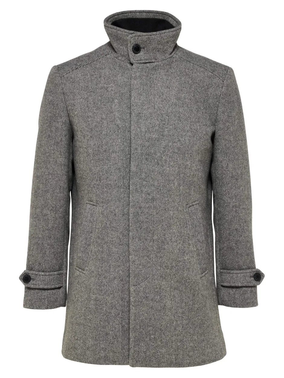 Selectedin miesten korkeakauluksinen villakangastakki. – Korkea kaulus – Napitetut hihansuut – Nappikiinnitys – Mitoitus polven yläpuolelle – Sivutaskut