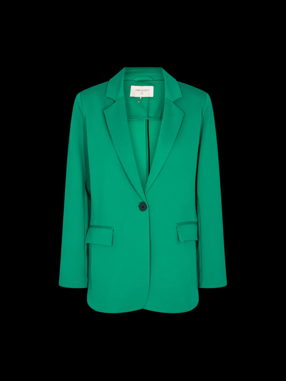 Freequentin tyylikäs, yksivärinen bleiseri. Klassinen siluetti, suora istuvuus, nappikiinnitys edessä ja etutaskut..